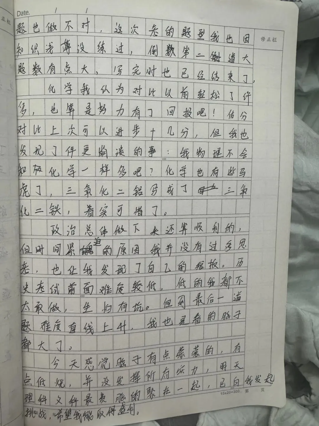 化学我认为对比以前轻松了许多,也算是努力有了回报吧!估分对比上次可以进步十几分,但我也发现了一件更崩溃的事:我物理不会和化学一样差吧?化学也有些马虎了,三氧化二铝写成了三氧化二铁,着实可惜了。