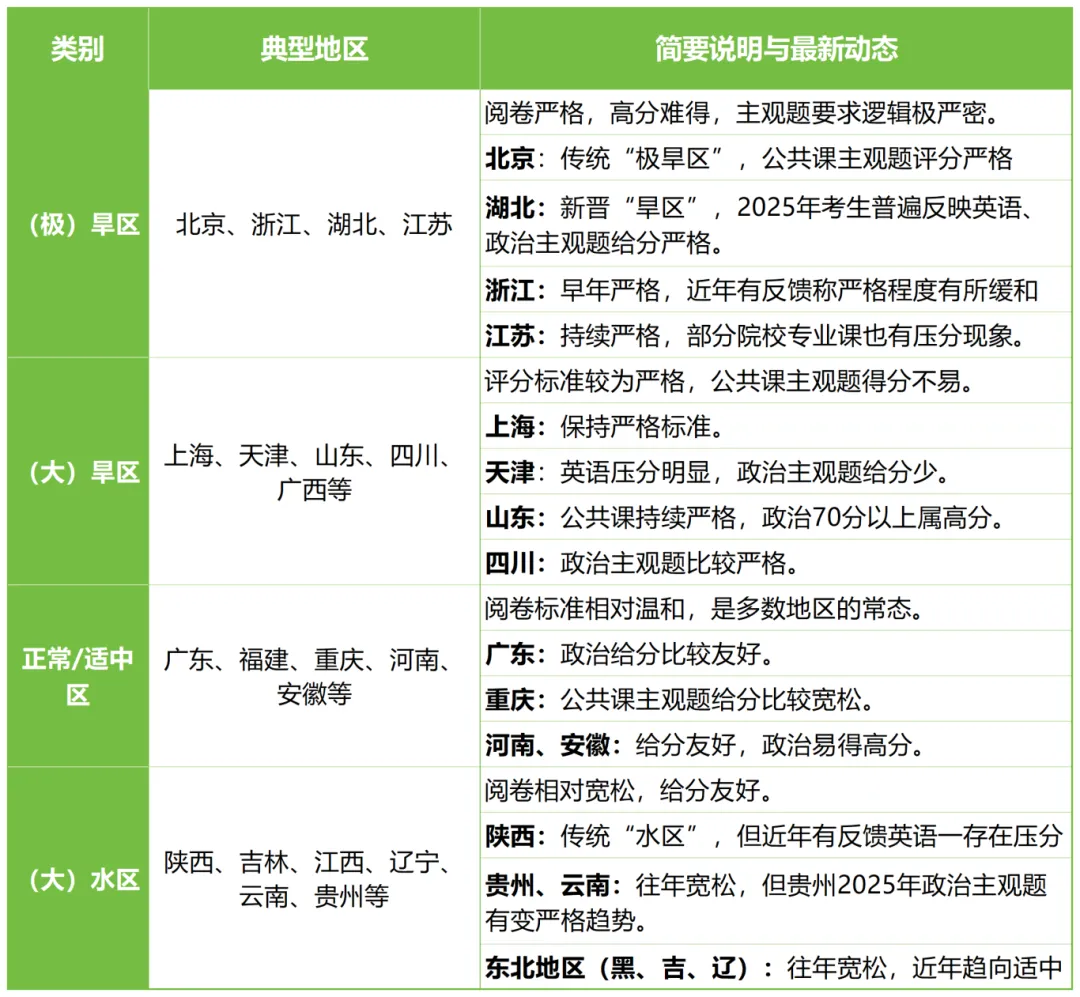 旱区:多为名校云集、考生众多的地区(如北京、上海),为筛选优中选优,主观题给分严格。