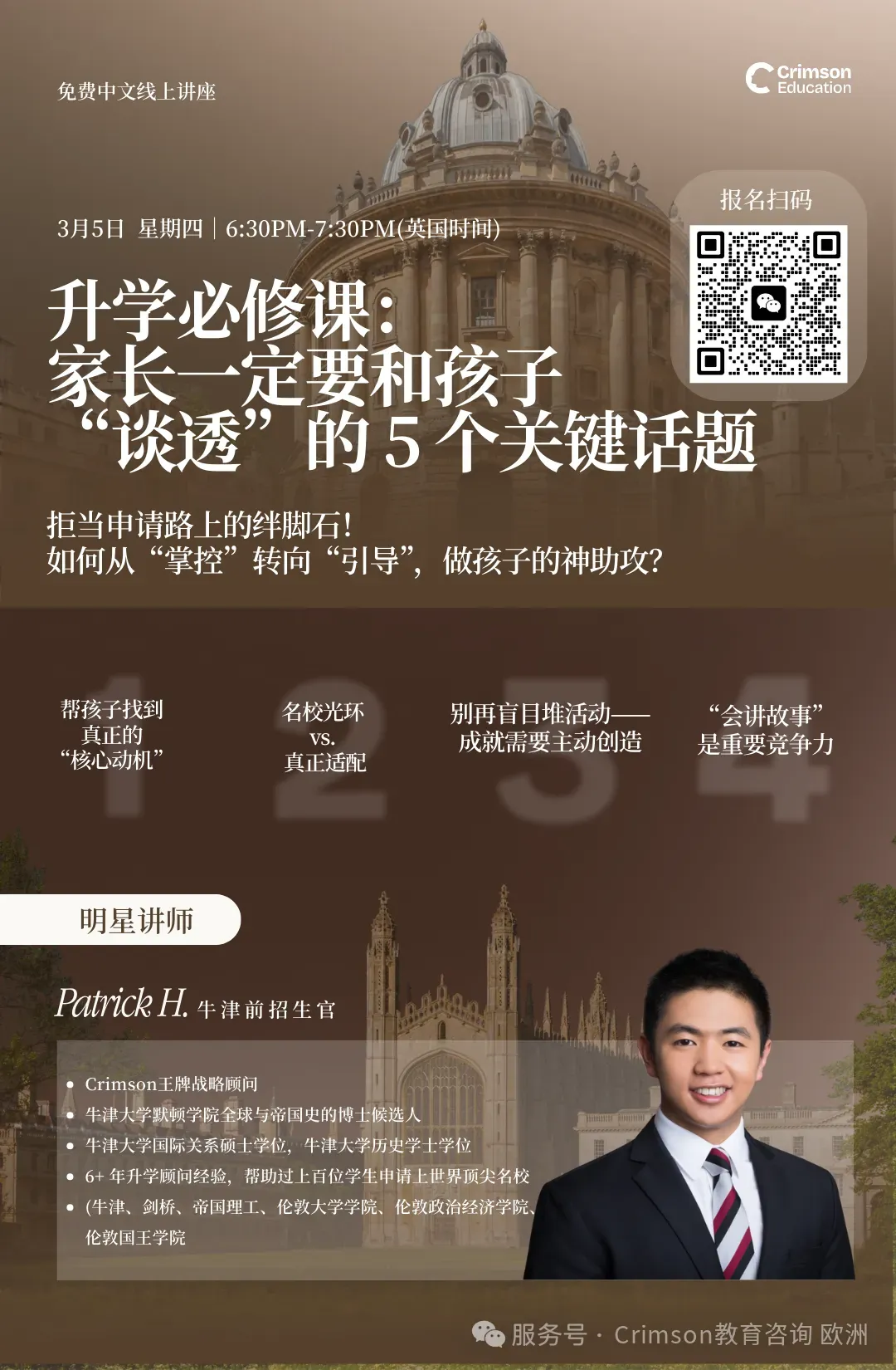 在 Patrick 看来,申请牛剑不仅是一场学术的长跑,更是一次家庭智慧的博弈。他将把那些冷冰冰的政策,转化为每一个家庭都能听懂、能落地的实操建议🤝 拒绝「无效沟通」,把升学分歧转化为名校入场券!扫码回复 “ukkids”报名!