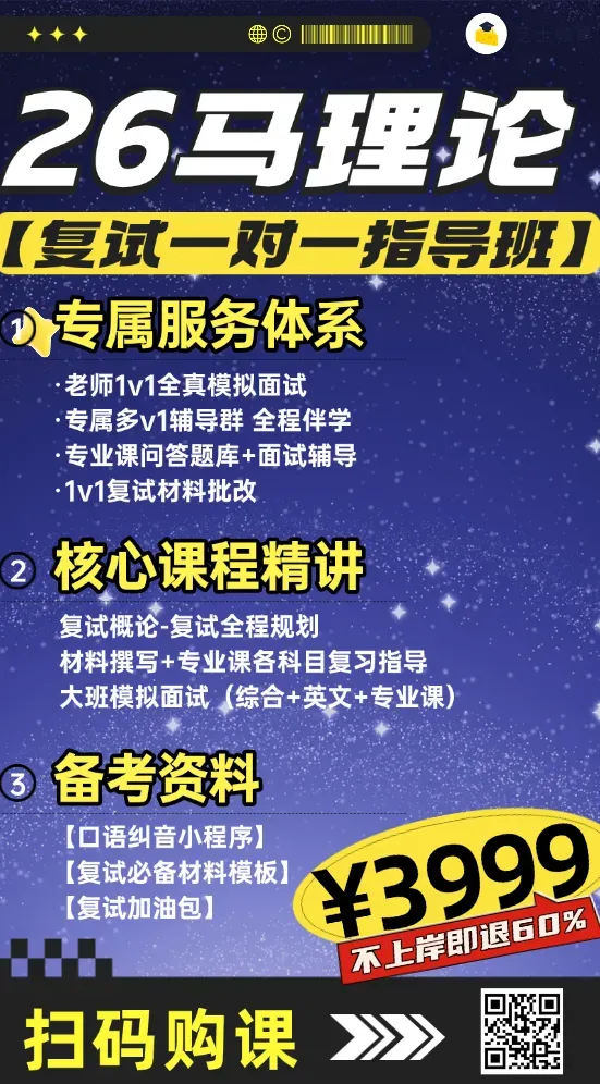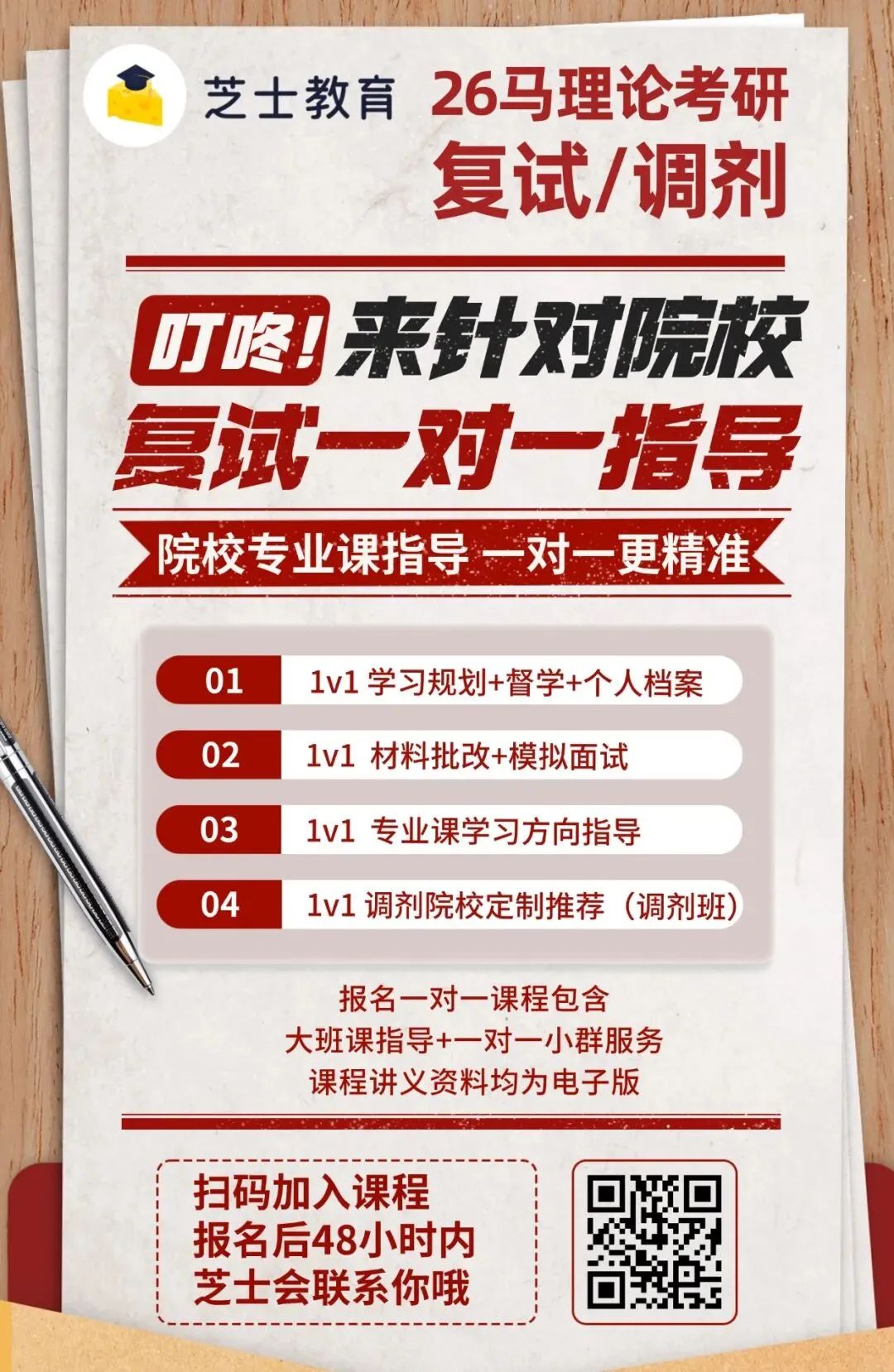 ‼️ 同学们如果觉得短时间内仅靠自己备考复试有困难的话,可以加入我们芝士马理论复试一对一团队,群内多对一服务,助力你复试成功!但是限报200人哦~