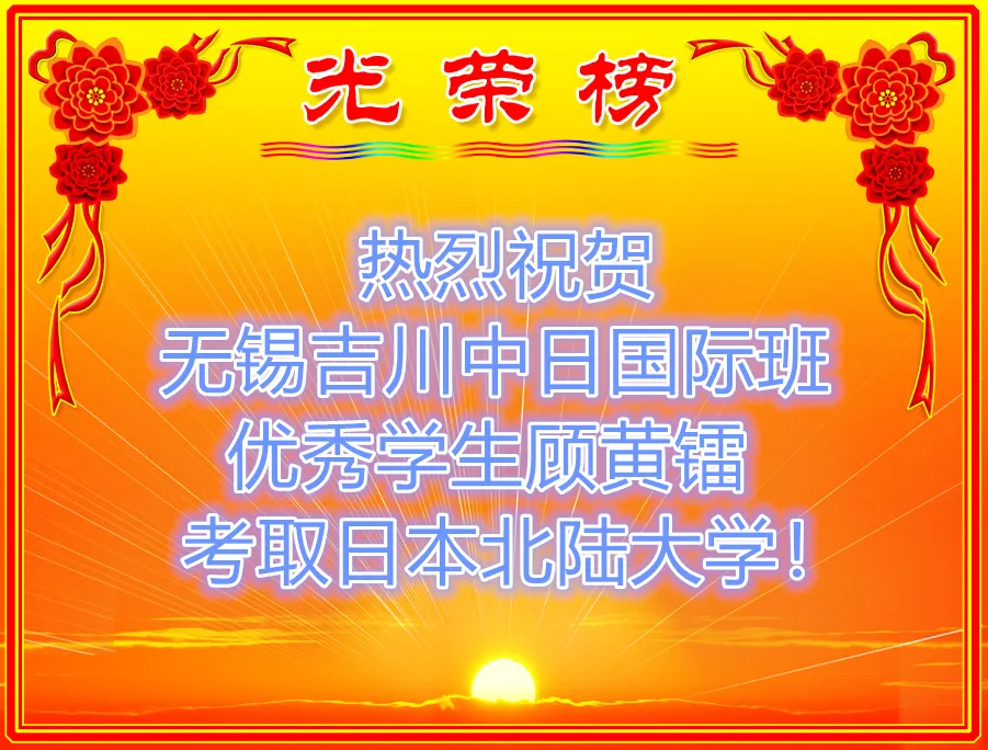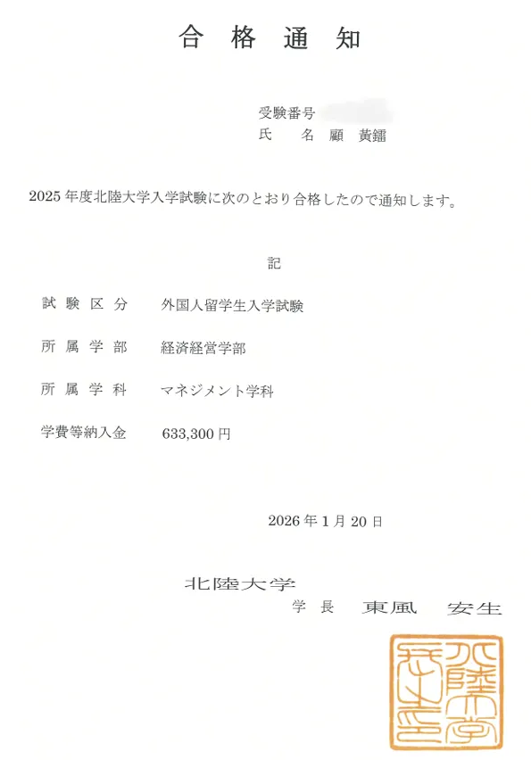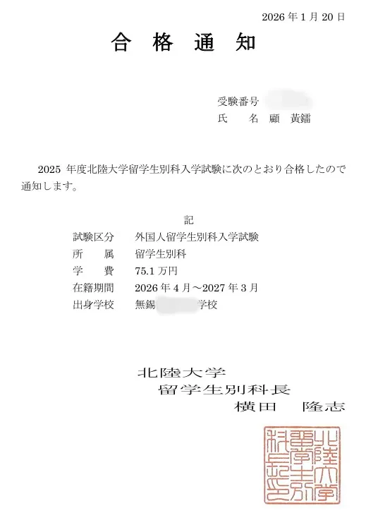 2026年1月20日,这是令人难忘的一天,经过几个月的不懈努力,无锡吉川中日国际班的顾黄镭同学总算收到了日本北陆大学的录取通知书,这份珍贵的通知书真的是来之不易,首先让我们一起欣赏一下!以下是本科录取通知书喔!小顾同学合格的是:经济经营学部-管理学科!除了本科合格以外,小顾同学还合格了北陆大学的别科喔,用日语实力证明了一切!