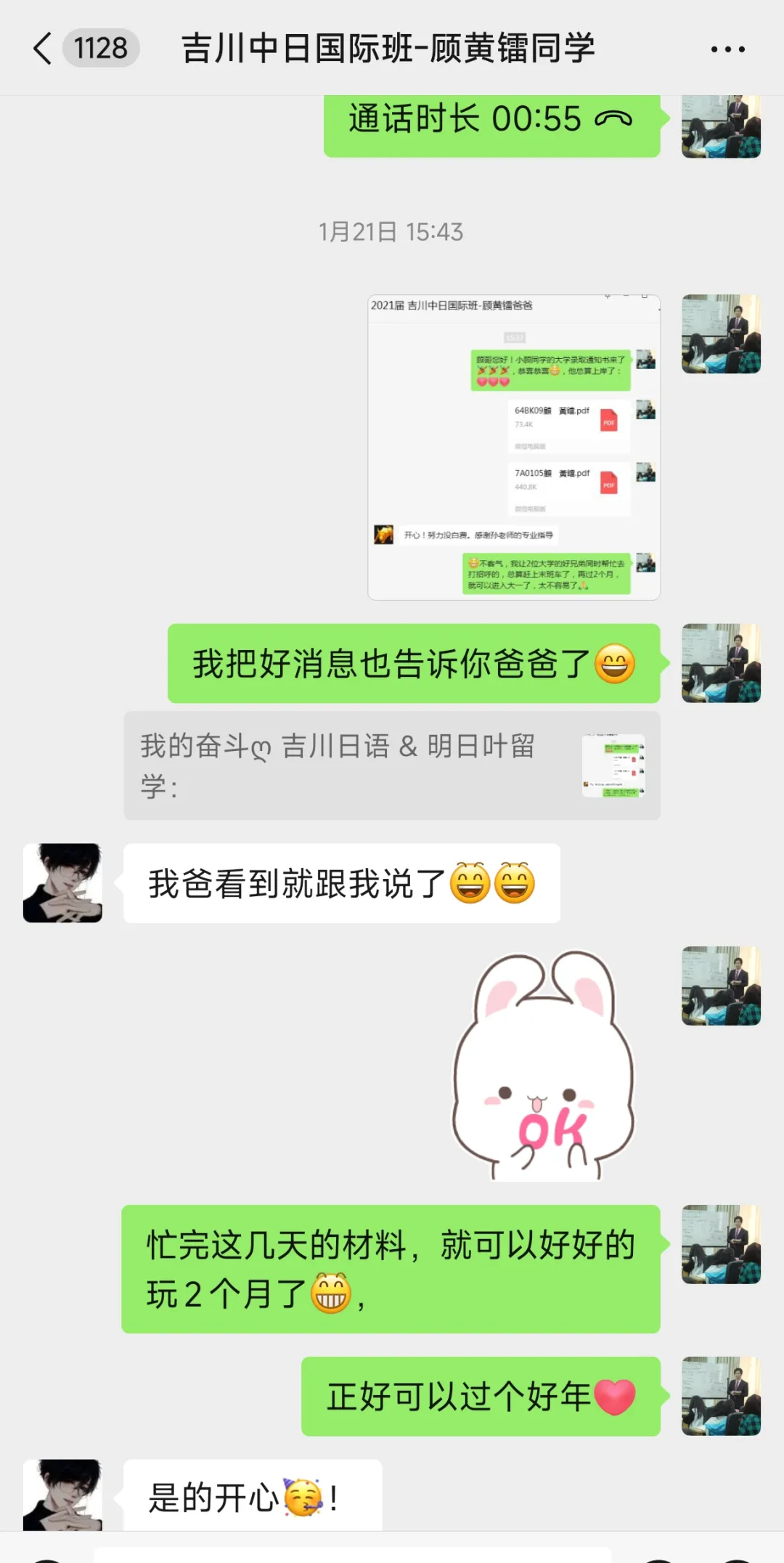 在随后的一个月中,小顾同学不断的复习日语,不断的练习大学往年的考试真题,在1月13日那天,前往参加大学直招校内考,经过半个月的耐心等待,在2026年的1月20日,我们最终迎来了升学的好消息!小顾同学被日本北陆大学成功录取!并且是被经济经营学科和别科双录取喔!孙校长也在第一时间将好消息告诉小顾同学和他的父亲: