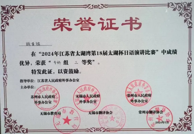 2024年5月18日 江苏省太湖湾日语大赛总决赛在苏州科技大学落下帷幕。小顾同学代表国际班前往参加,经过激烈的竞争,最终取得了学生组“三等奖”的好成绩: