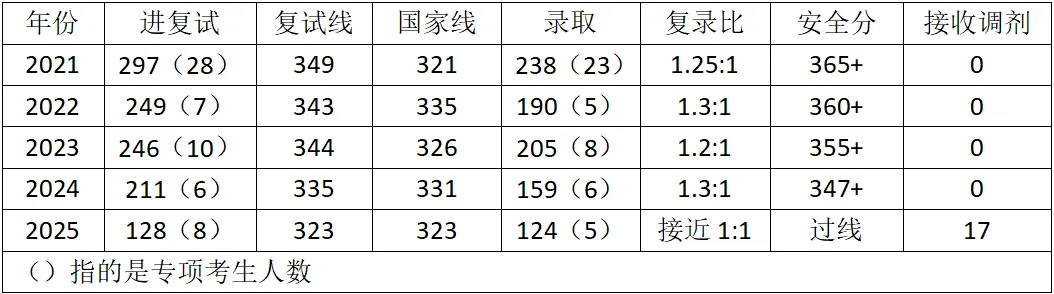 热度方面,21-22年属于热度飙升阶段,全日制的报录比从10:1上涨到21:1,之后回落趋于平稳,23-25年都在14:1左右,竞争强度逐年下降,这个可以从复试线,复试安全分等方面看出来。