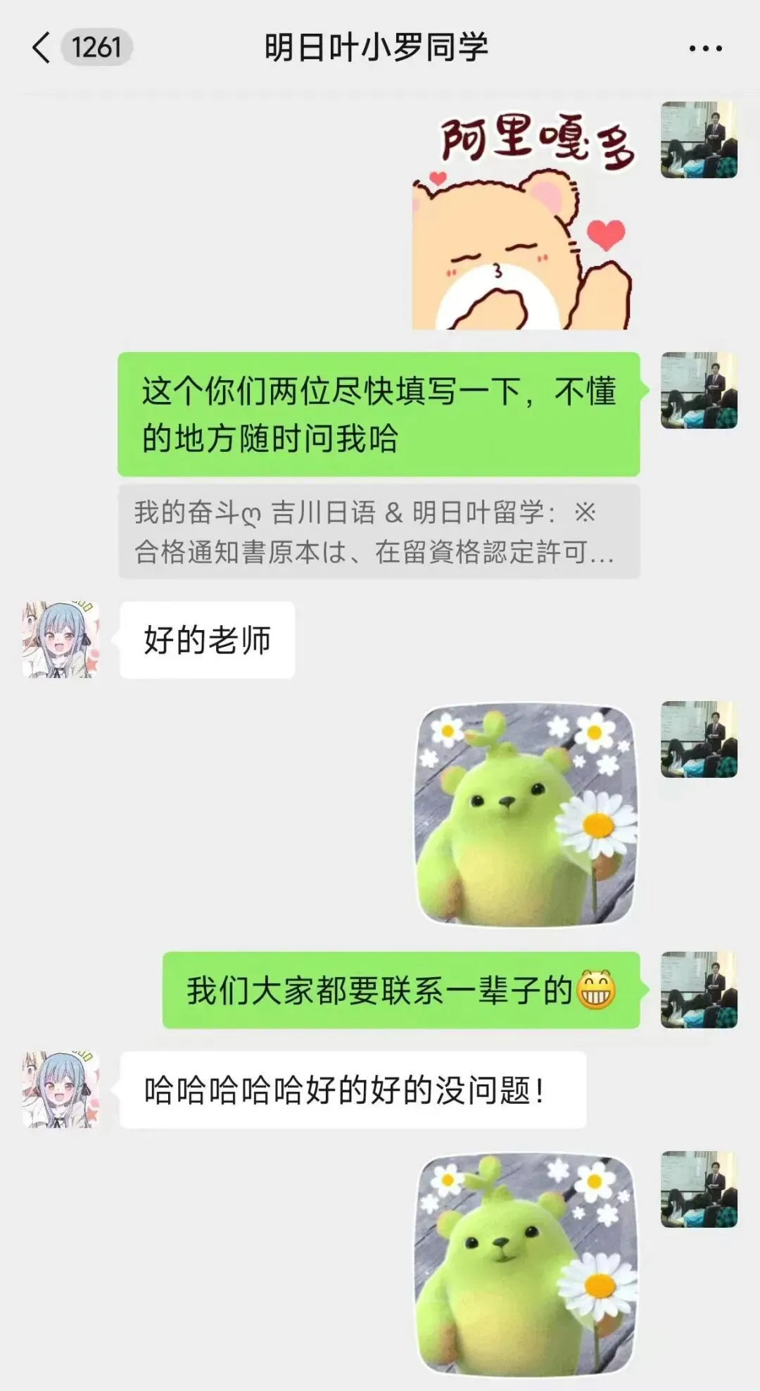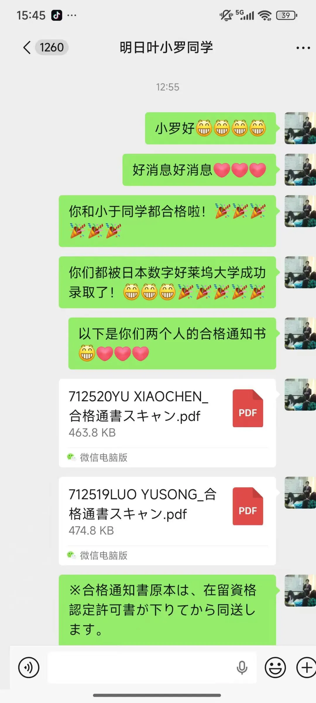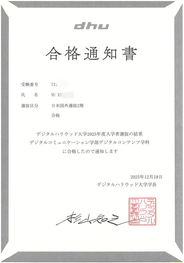 2025年12月19日,是数字好莱坞大学发榜的日子,也是2026年4月生入学的最后机会,功夫不负有心人,在经过半个月耐心的等待后,我们迎来了激动人心的时刻!明日叶小宸同学被数字好莱坞大学的数字传媒学部成功录取!接下来,先给大家分享一下她的录取通知书喔!这份宝贵的录取通知书,既是对其日语水平的认可,也是师生们共同努力的结果。向其表示祝贺!说起小于同学和明日叶的缘分,还得从2025年的11月初开始说起,此时的她刚刚从日本语言学校毕业后回国,在语校期间,她的eju日语科目考了340多的高分,也已经被日本顶尖名校录取,但和她的男朋友-小罗同学一样,为了前往自己喜欢的大学和专业就读,她毅然放弃顶尖名校的就读机会,而选择委托明日叶申请数字好莱坞大学,这份执着令人感动!虽然她住在遥远的吉林省长春市,与明日叶留学所在的江苏省无锡市相距几千公里,也许是我们的专业度和对事业的执着打动了她,在经过很多家留学机构的对比之后,11月12日,她和男朋友小罗同学一起,毅然委托明日叶办理留学,并与我们正式签订留学合作协议:随后,明日叶孙校长与小于同学进行了前期沟通,也分享了很多日本大学的资料给她参考,最终,她决定报考数字好莱坞大学!在前期的备考过程中,明日叶孙校长整理了很多日本大学的常见问题集,并分享给她,让小于同学填写完之后,一个一个进行润色修改,并叮嘱她熟练背诵:在距离考试还有一个月的时间内,明日叶孙校长多次与其连线,进行模拟面试考试,对于面试问题回答不足的地方,孙校长都进行了指正和建议,并纠正读错的单词和句子。在考试的前一天,孙校长仍然给其打电话,让她不要紧张,用平和的心认真对待就好,也把一些考试技巧告诉了她。功夫不负有心人,努力总会有回报,经过半个月的耐心等待,我们总算迎来了成功的喜悦!当拿到录取通知书的那一刻,明日叶孙校长激动的立马把好消息分享给了小于同学和她的男朋友:小于同学和男朋友得到喜讯后,也非常开心,并向孙校长表示感谢之情:虽然两位同学都合格了,但是我们的服务并没有结束,关心爱护每一个学生,是我们明日叶老师们共同的使命!我们要把良好的口碑传承下去!明日叶孙校长也向他们传达了一辈子保持联系的意愿:最后,再次祝贺两位远在吉林省长春市的小徒弟,祝愿他们前程似锦!归来仍是少年!数字好莱坞大学建立于2005年,是一所专业性学习3DCG·VFX、游戏·编程、映像、动漫、平面设计、网页设计、媒体艺术、宣传·PR·商务这八大领域的4年制本科大学。我们与未来相连接,拥有学习融合所有数字领域的独自课程。与企业相关联,拥有众多业界网络,支援学生实现自己的梦想。与专业制作现场相连结,拥有活跃在数字媒体行业第一线的专业教师队伍。如果您想要了解更多的日本留学、日语学习、以及中日文化交流资讯,请您持续关注无锡吉川日语 • 明日叶日本留学中心的微信公众平台哦!