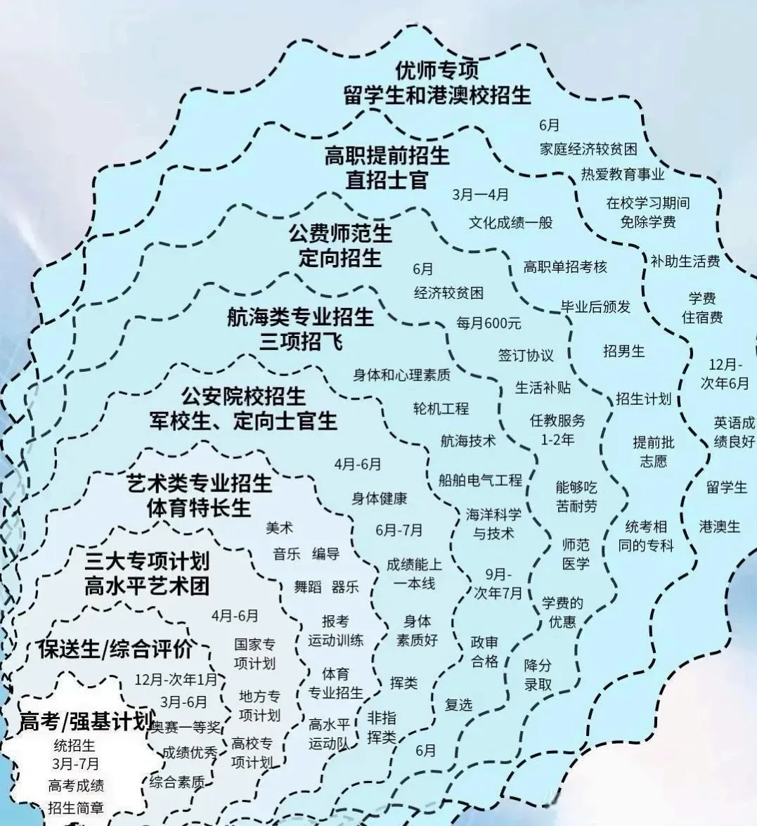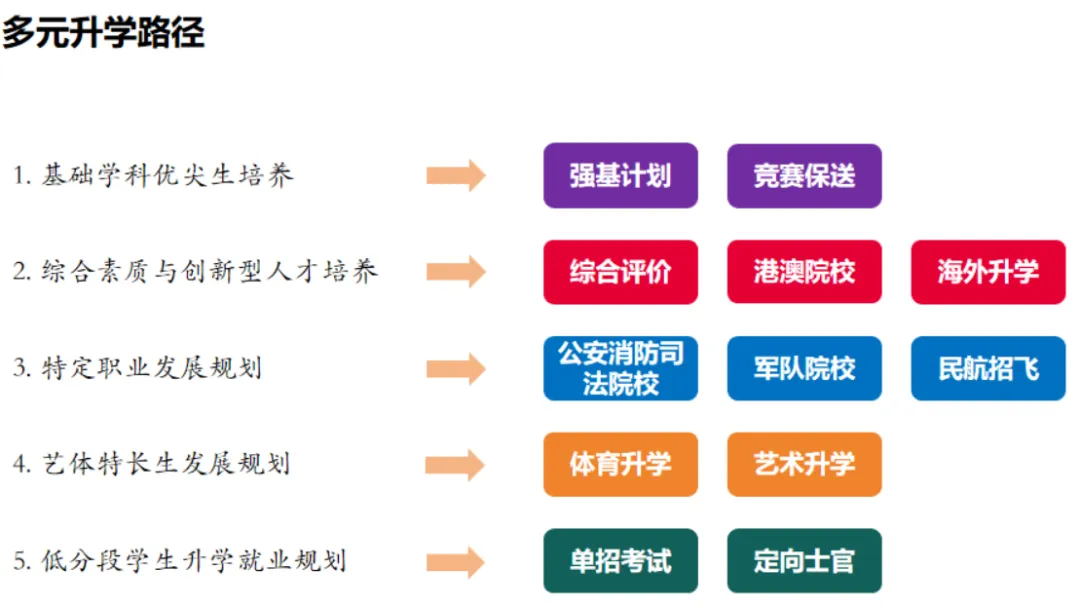 1.高分选手路径:如果平时成绩还不错,可以考虑走综合评价或者是强基计划,需要提前准备一些材料,建议想走这条路的早准备!!2.特殊就业升学路径:定向招生、招飞、航海、公安等。3.其他升学路径:中外合作办学、港澳院校/海外留学、艺体类、专项计划(高校专项、地方专项)。