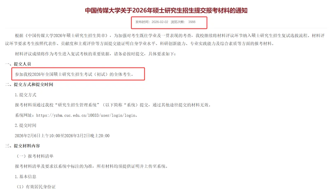 今日,中国传媒大学发布公告,要求报考该校的考生提交26研招相关复试评议材料;具体看看: