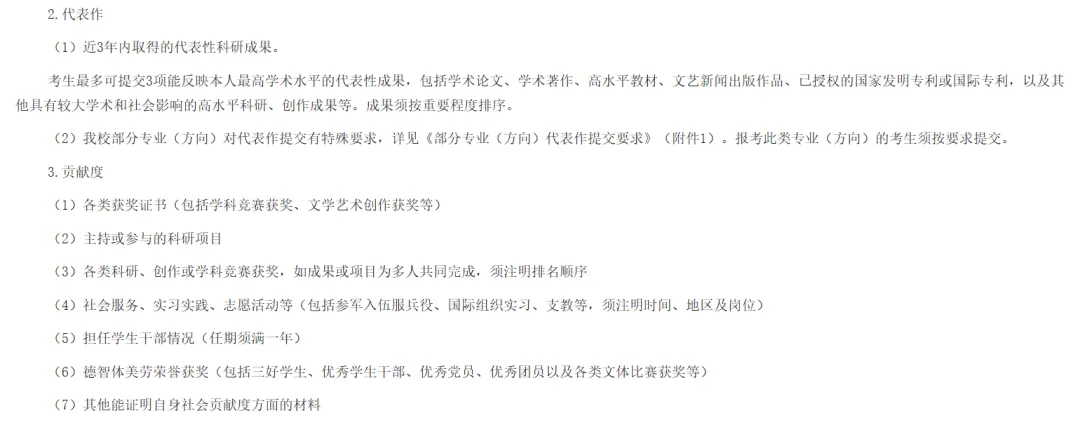 复试选拔流程包括材料评议和复试考核两个环节,材料评议环节要求考生按照代表作、贡献度和主观评价等方面提交能证明自身学业水平、科研创新能力、专业实践能力及综合素质等方面的报考材料。