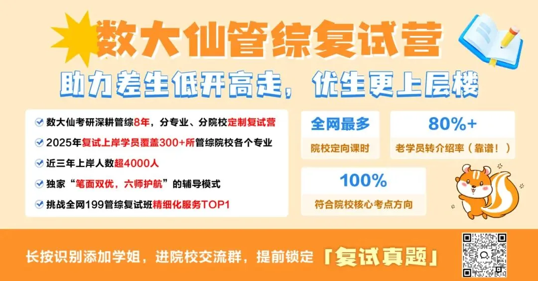 如果学校还没有公布复试科目和参考书目,可以先参考去年的进行准备,或者直接打电话向目标院校的研招办负责人咨询,也可以上各大自媒体平台请教上岸的直系学长学姐!或者直接联系我们的客服小姐姐哦~【数大仙管综复试辅导,专业的!分营定制,涵盖管综所有招生专业】