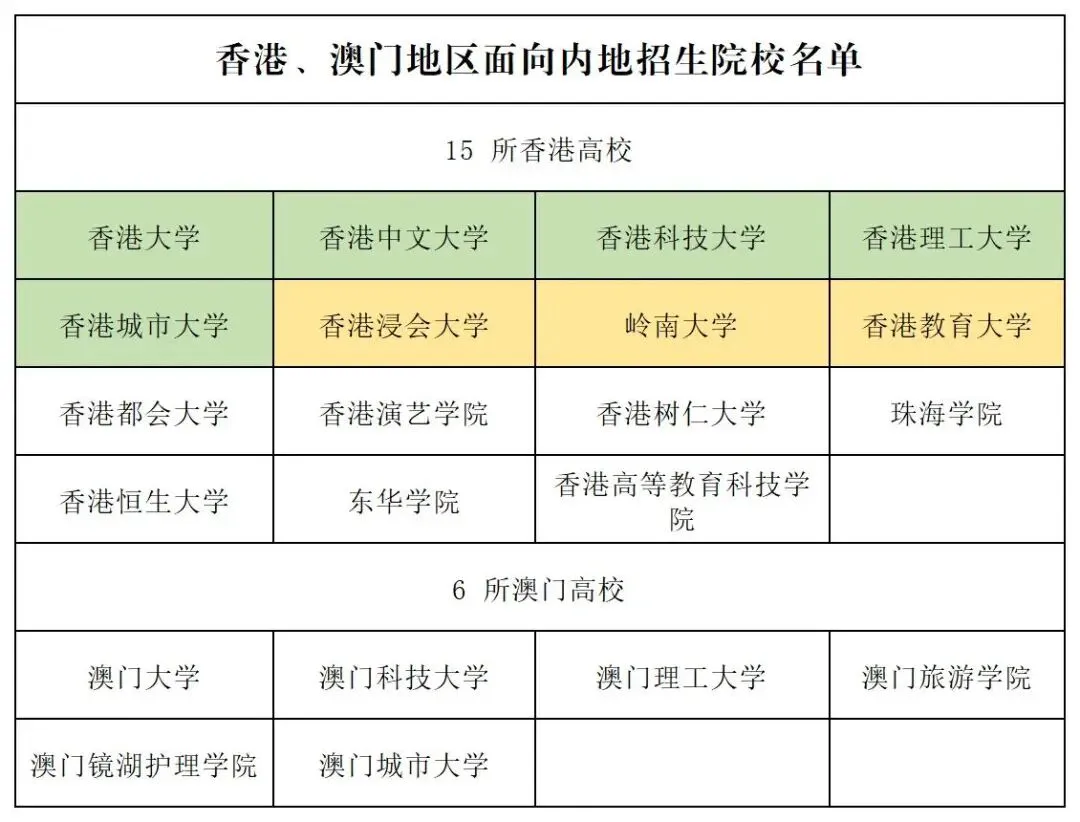 香港目前有15所院校在内地招生,澳门一共是有6所在内地招生,但并不是所有港澳校都在这个批次招生,像香港中文大学、香港城市大学、珠海学院这三所2025年就在提前批次里招生,称为港校统招院校。2026年港城大也划为自招了,也就是说2026年港校有13所会在这个批次。在这个批次被港校录取的学生,就不会参加后续批次的录取,但澳门的院校录取更为特殊一点,它不会占用录取名额,也就是说学生可以同时被澳门的院校和内地的大学录取。