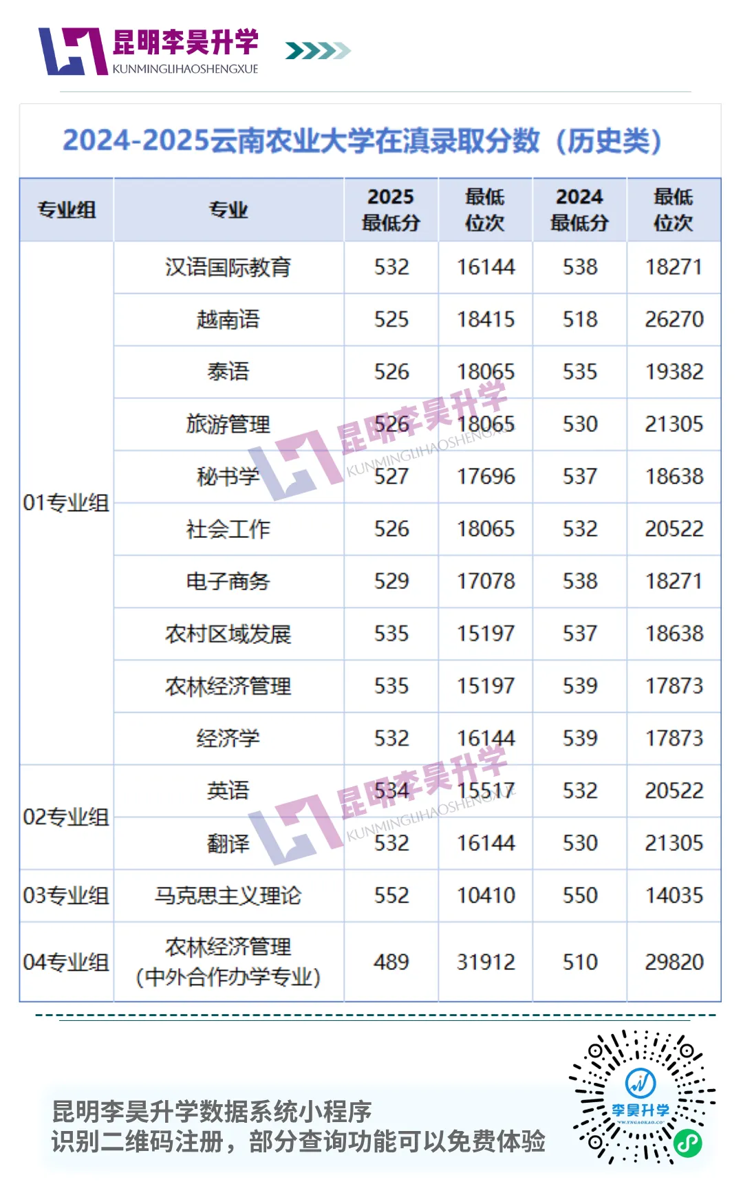 作为云南省属重点高校、国家“卓越农林人才教育培养计划”入选院校,云南农业大学扎根云岭大地,以农林学科为特色,兼具理、工、经、管、文、法等多学科协调发展,是省内考生报考农林类、应用型工科及特色文科专业的核心选择之一。2025年滇内招录已落下帷幕,该校各专业的录取分数与位次变化,不仅反映了专业热度的动态调整,更折射出考生对就业前景、学科实力与政策导向的多元考量。李昊升学将结合2024-2025年的录取数据,为大家梳理云南农大在滇招录的分数特征与趋势,助力考生和家长更清晰地把握报考方向。从2024-2025年云南农业大学在滇历史类的录取数据来看,整体呈现出“分数波动调整、位次普遍前移、专业热度分化”的特点,反映出该校在本地考生中的吸引力和专业竞争格局的变化。从整体趋势来看,2025年多数专业的录取最低分较2024年有所下降,但对应的全省最低位次却显著提升。这说明虽然分数门槛略有降低,但报考人数增加、竞争更加激烈。例如:越南语专业:2024年录取最低分518分,位次26270名;2025年分数升至525分,但位次大幅前移至18415名,竞争热度明显上升。旅游管理专业:2024年最低分530分,位次21305名;2025年分数微降至526分,位次却跃升至18065名,反映出考生对该专业的关注度显著提升。专业组间的热度差异也十分明显。03专业组马克思主义理论是历史类中竞争最激烈的方向,2025年最低分达552分,位次10410名,且分数和位次均较2024年有所提升,体现了考生对思政类专业的持续追捧。相比之下,04专业组农林经济管理(中外合作办学专业)是录取门槛最低的方向,2024年最低分仅489分,位次31912名,虽分数较2024年略有下降,但位次后移,说明该专业的报考热度相对平稳。在具体专业中,农村区域发展、农林经济管理等涉农相关专业,2025年最低分均为535分,位次15197名,较2024年位次大幅前移,反映出在乡村振兴政策背景下,涉农管理类专业的报考热度正在持续上升。从2024-2025年云南农业大学在滇物理类的录取数据来看,整体呈现出“位次竞争整体趋紧、特色专业持续升温”的特征,反映出考生需求与专业发展趋势的深度关联。不同专业组的热度差异十分显著。03专业组涵盖专业数量较多,集中了全校竞争最激烈的专业:- 电气工程及其自动化专业2025年最低分达554分,位次29087名,是物理类录取门槛最高的专业之一。