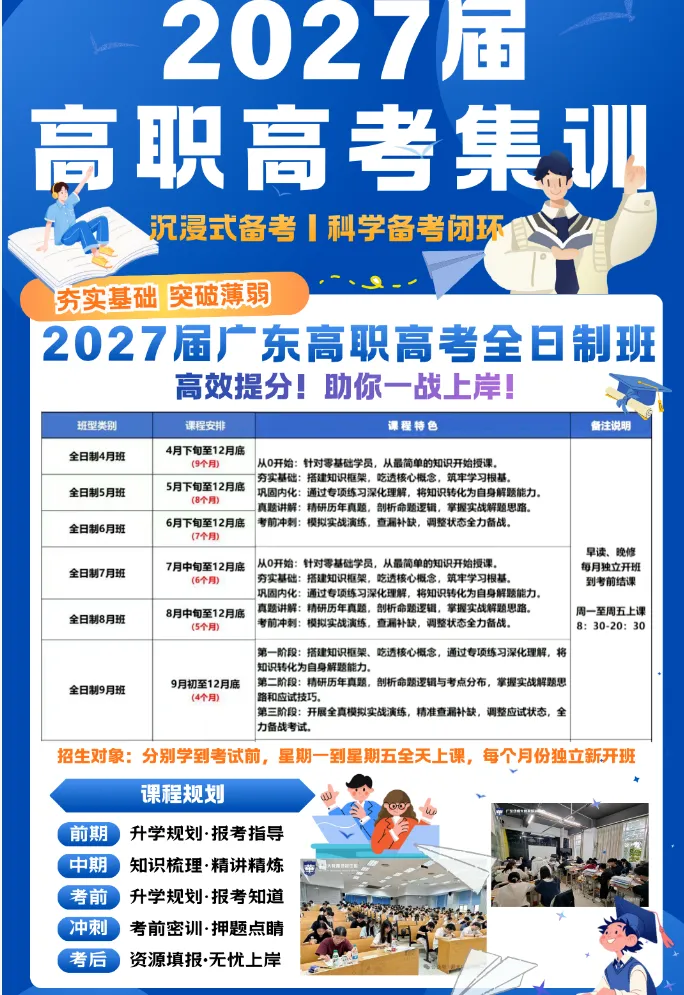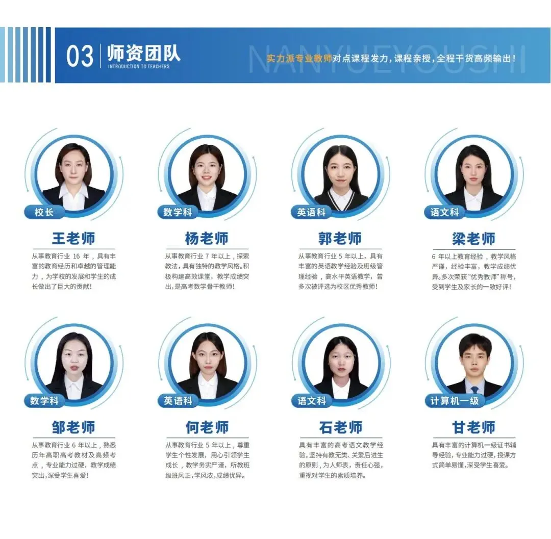 班主任:专职班主任全程 跟 踪辅 导 、以人为本 、 因材施教 、管理学 生 学习 督 促 、 考勤 , 定期心理疏导等。