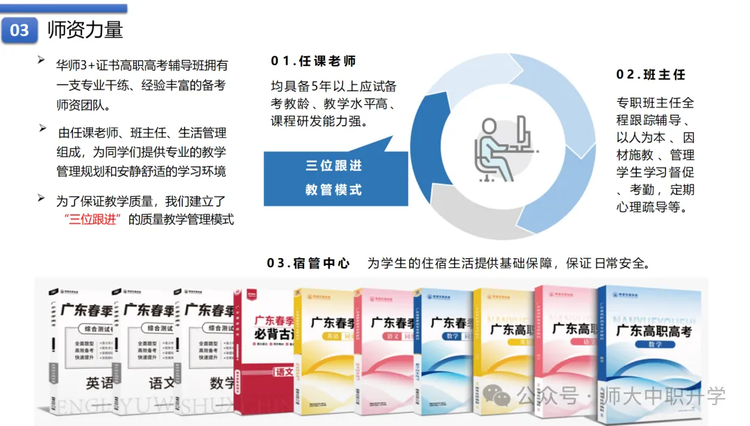 教师都具有多年高职高考授课经验,在我们这边任职五年以上教学经验的骨干教师,均为重点大学硕士研究生毕业,华师3+证书高职高考辅导班拥有一支专业干练、经验丰富的备考师资团队。