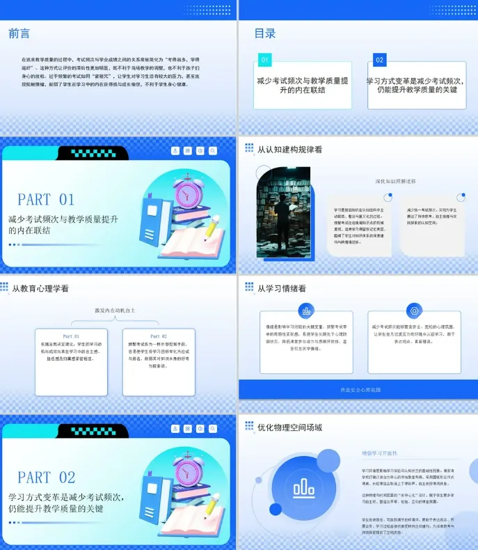 今天要分享的课件是:《党课减少考试频次关键同步推进学习方式的系统性变革PPT课件》,讲稿字数:2243字,党课ppt页数:14页。减少考试频次必须与学习方式的系统性变革同步推进,这是避免政策流于形式的关键。单纯压缩考试次数而不改变教学逻辑,不仅无法缓解学生压力,反而可能引发教师教学失据、家长焦虑加剧等新问题。当前过度依赖纸笔测试的评价体系,实质是以标准化测量替代个性化成长观察,导致学习异化为机械训练。只有将考试频次调整作为撬动整个教育生态改革的支点,同步重塑课程、教学与评价机制,才能实现从"应试导向"到"素养导向"的真正转型。