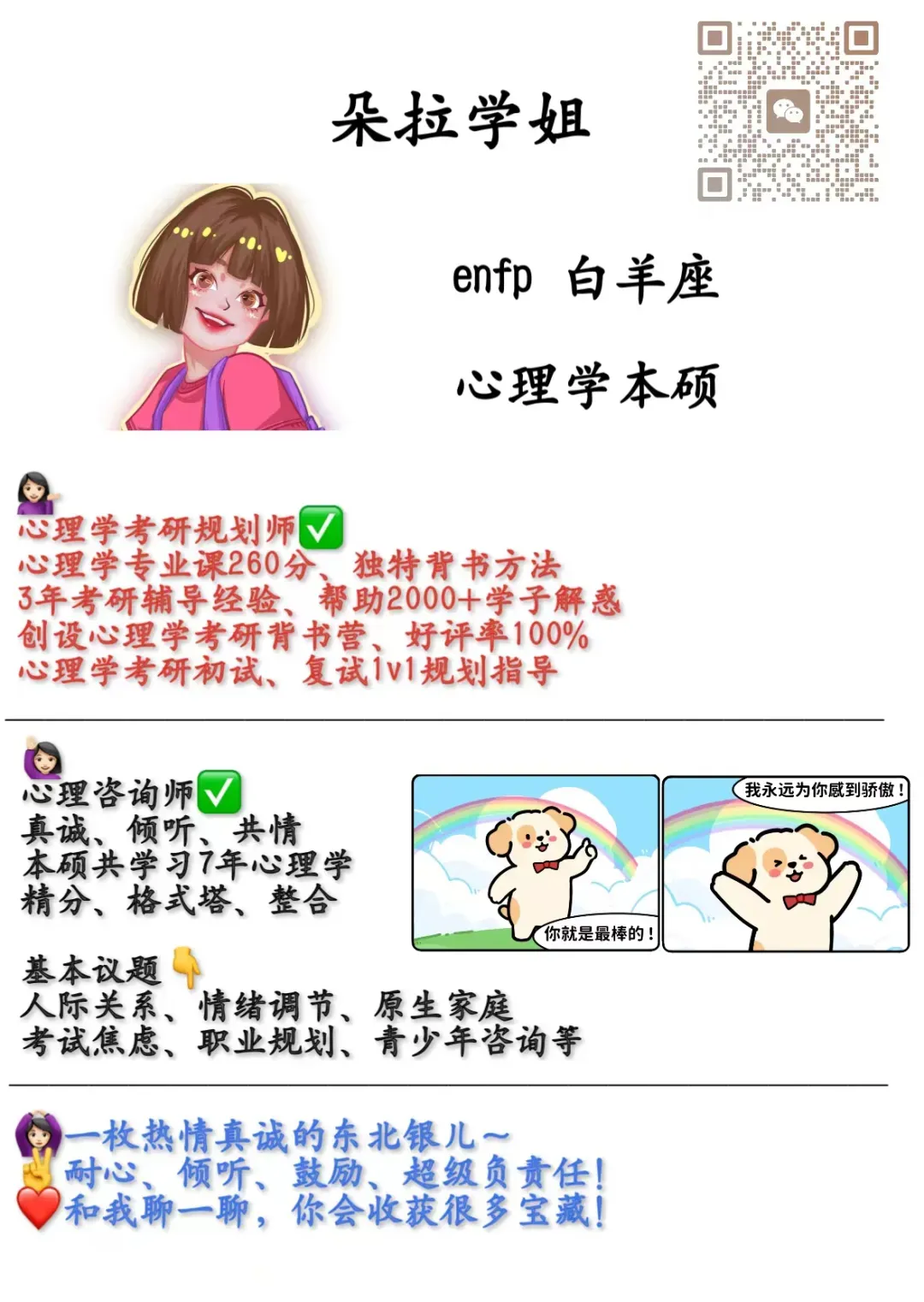 各位宝子们,朵拉学姐本硕心理学专业,考研专业课260分,参加过一志愿学校的复试+调剂学校的复试,目前开启了第5年的心理学考研辅导!拥有非常丰富的心理学考研初试及复试、调剂经验!