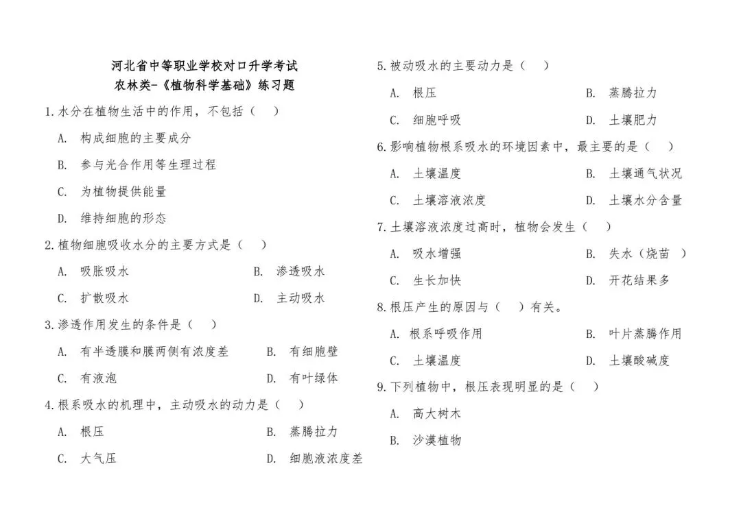 【农林】河北省中等职业学校对口升学考试—《植物科学基础》练习题