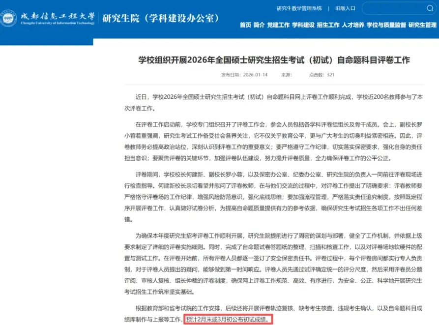 成都信息工程大学研究生院同步官方查分时间安排,明确2026考研初试成绩预计在2月末或3月初公布。