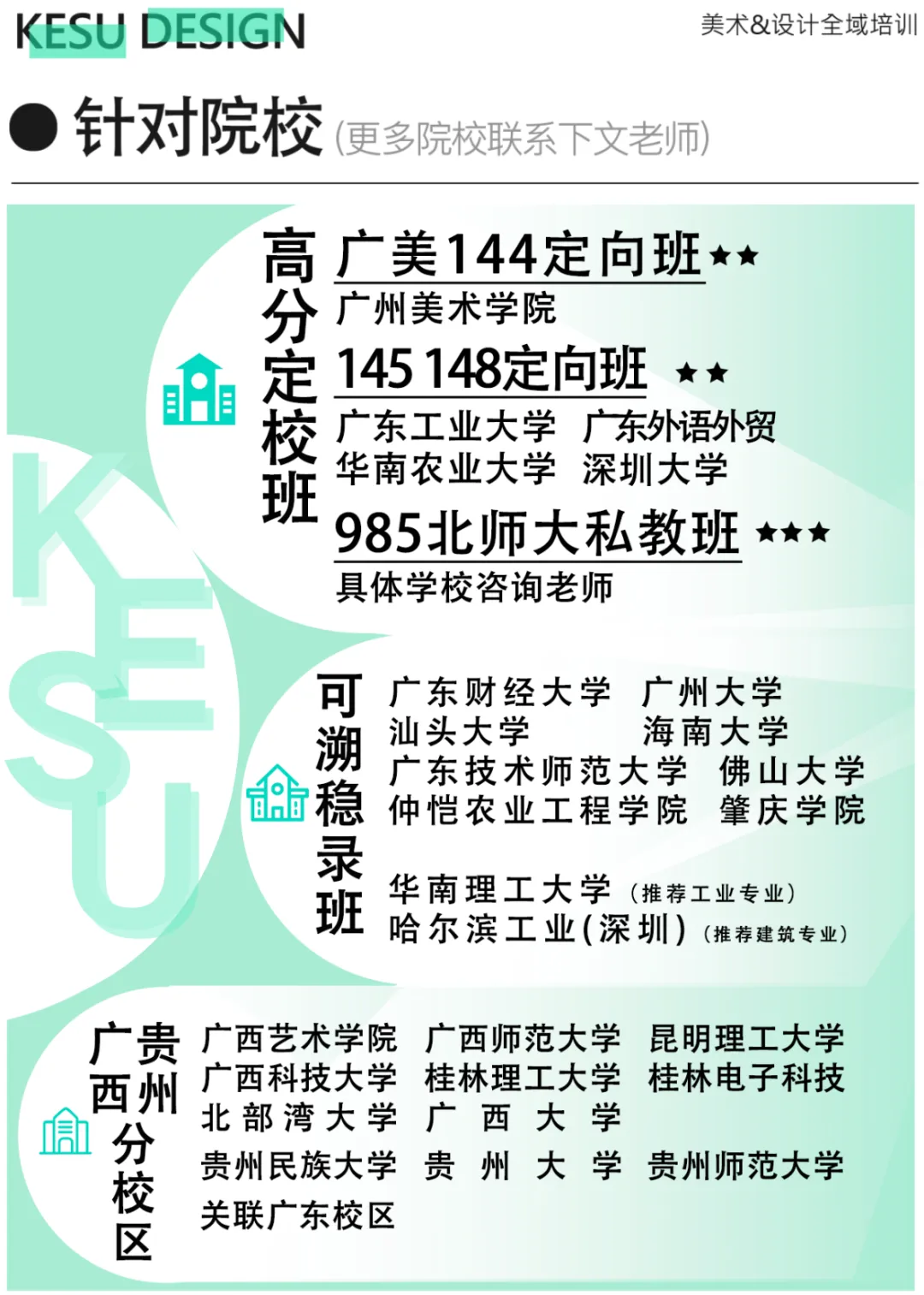 可溯教育.考研是一家起源于2013年沉淀13年有余的广州老牌机构,早年针对广州美术学院 广东工业大学 华南农业大学 北京师范大学 华南师范大学 广东外语外贸大学 深圳大学 广东财经大学 广州大学 汕头大学 广东技术师范大学 佛山大学 华南理工大学等艺术设计类相关专业,师资来源于广州美术学院/广东工业大学/北京师范大学/华南师范大学/华南农业大学等硕博师资,历年多所院校占据高分135 144 145 146 147,录取稳定。可溯作为国内早批设计美术考研服务平台,曾受邀CCTV央视访谈,对话央视主持人李思思老师,为艺术考研领域发声献策。可溯坚持全职老师在线、专业扎根,可溯精准中小班,实现常年一对一辅导,无论是零基础、跨专业还是有基础的都可以系统的提升专业水平,产出方案成果,是广州少有的兼具历史沉淀、责任和一线名师的机构。
