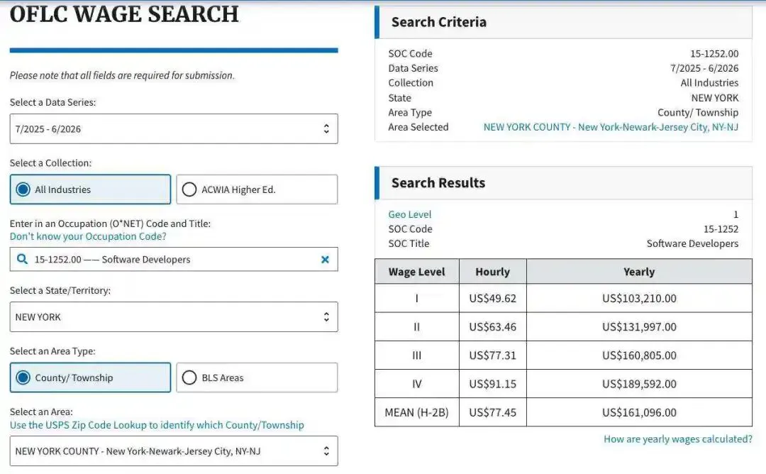 想要查询自己的薪资等级,可以使用DOL的工资查询工具,输入所在州、地区、职业名称/代码、年份即可查询,示例如上,链接:https://flag.dol.gov/wage-data/wage-search。