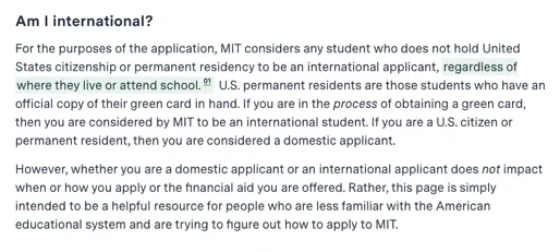 麻省理工学院将没有美国国籍或永久居民身份的学生视为国际申请者,无论他们居住在哪里或就读于哪个学校。来源:麻省理工学院官网