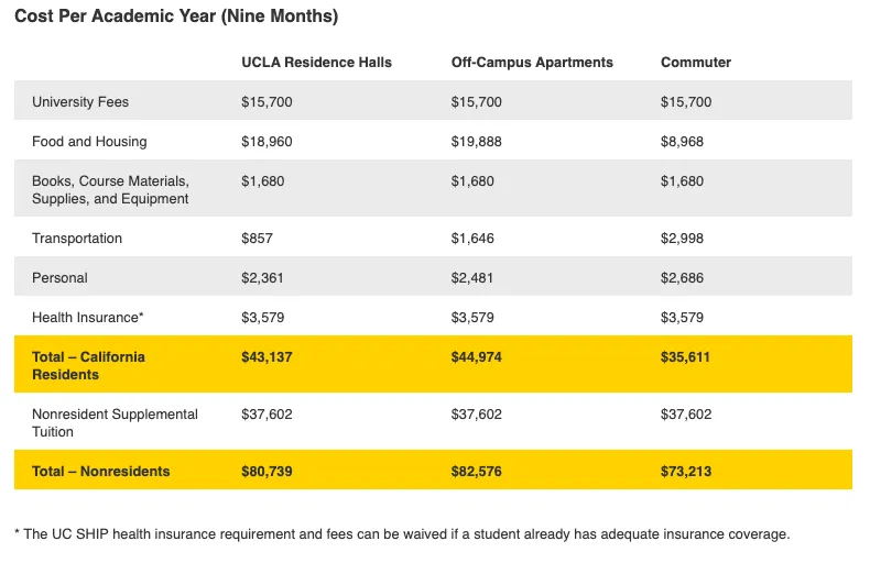 还是以加州为例,本地学生学费通常只是国际生的三分之一甚至更低。根据加州大学洛杉矶分校官网公布的2025-2026年学费,加州本州学生每年总费用(学费+食宿+其他)约$43,137,比外州学生总费用$80,739便宜3.7万多美元(约合人民币26.3万)。