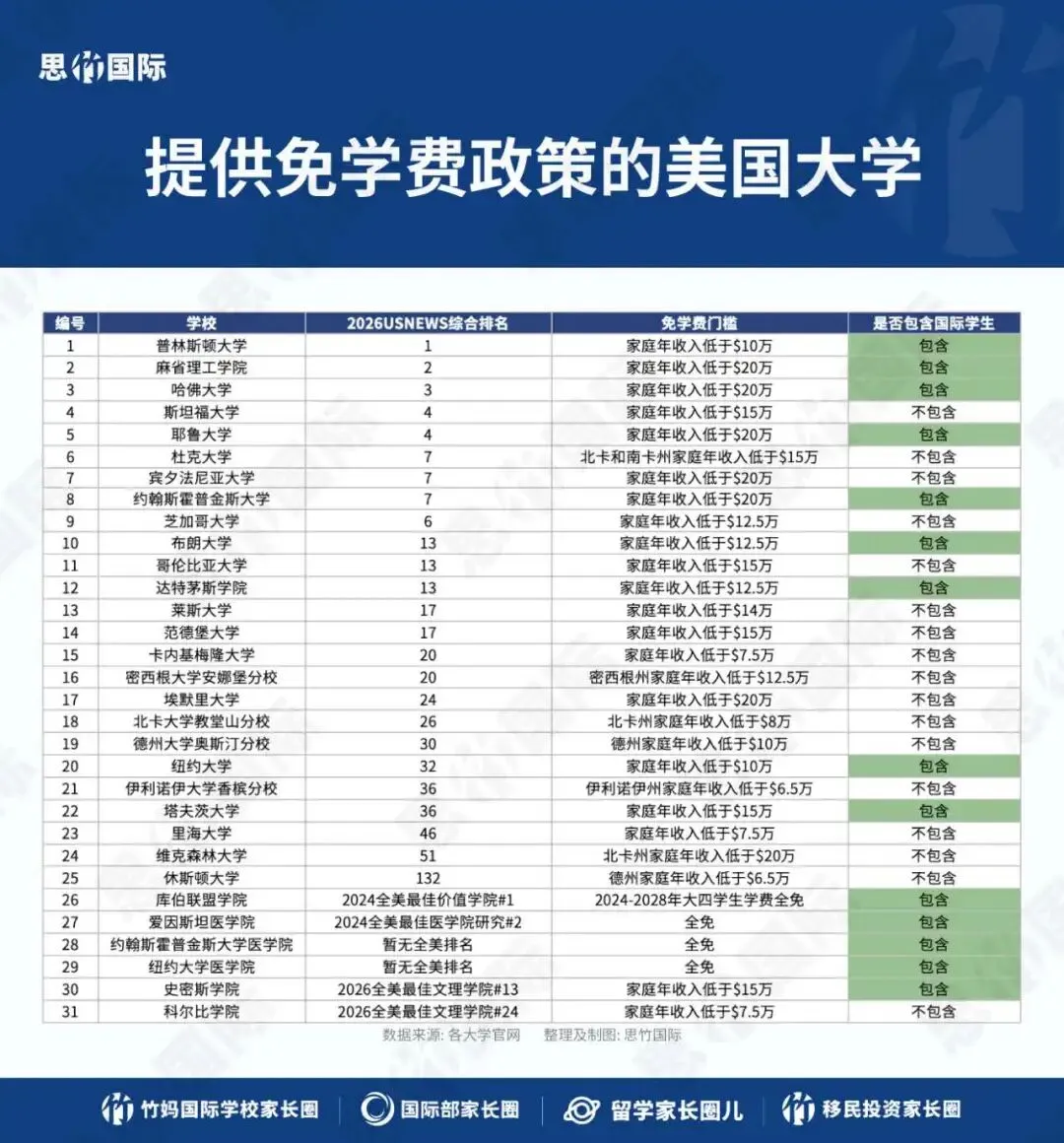 最近2年,还有部分知名公立大校,宣布给本州满足条件的学生免除学费。例如,密西根大学安娜堡分校(2026 USNEWS全美排名第20)为密西根州家庭年收入低于12.5万美元的美国学生和绿卡学生免学费;北卡大学教堂山分校(2026 USNEWS全美排名第26)为北卡州家庭年收入低于8万美元的美国学生和绿卡学生免学费;德州大学奥斯汀分校(2026 USNEWS全美排名第30)为德州家庭年收入低于10万美元的美国学生和绿卡学生免学费。