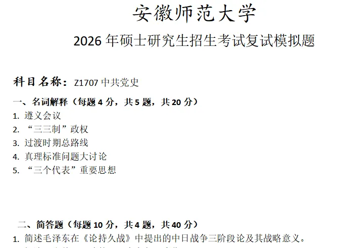 >安徽师范大学Z1707中共党史考研复试真题模拟