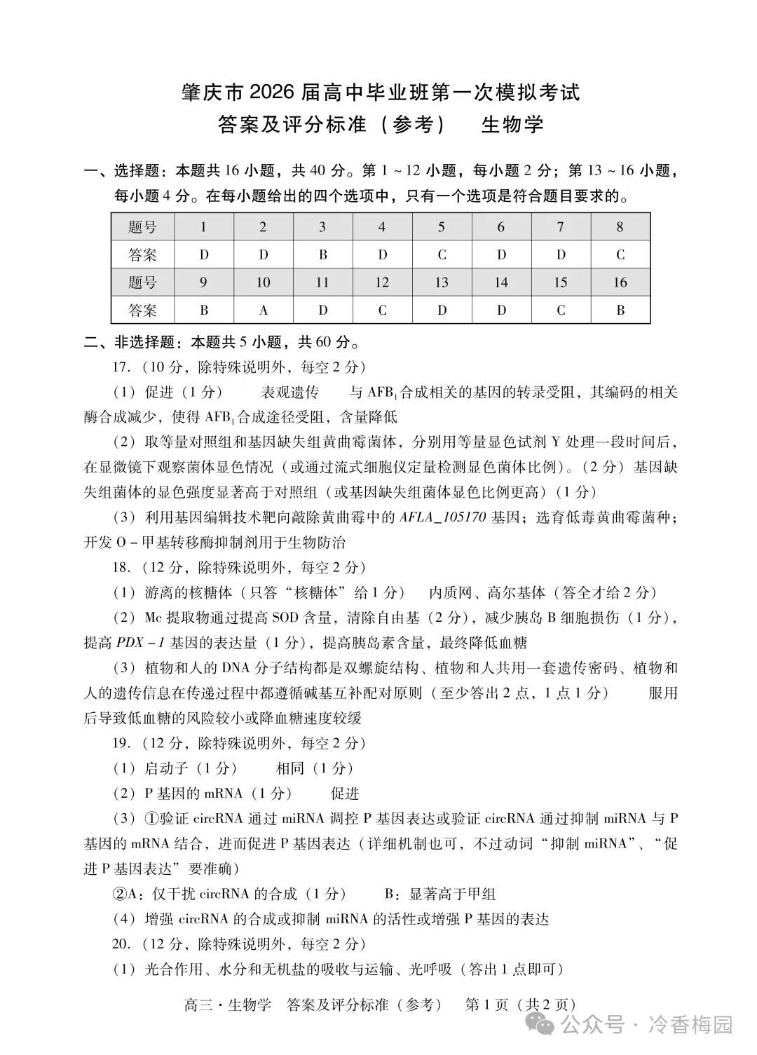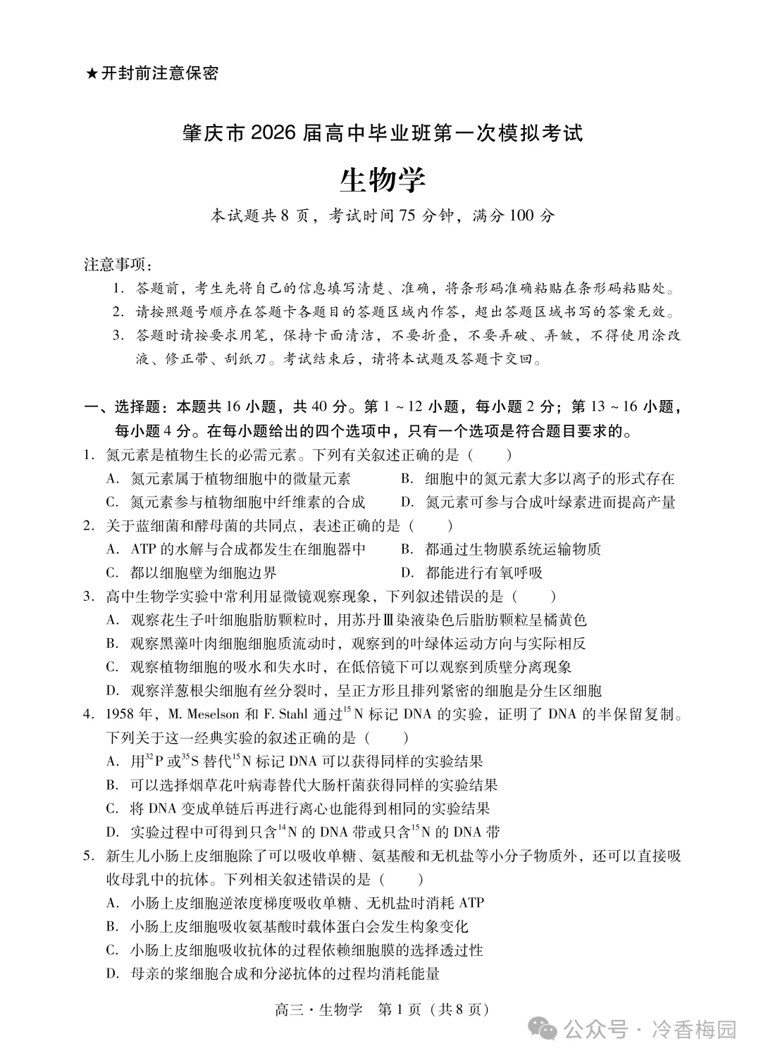 >2026肇庆高三第一次模拟考试生物
