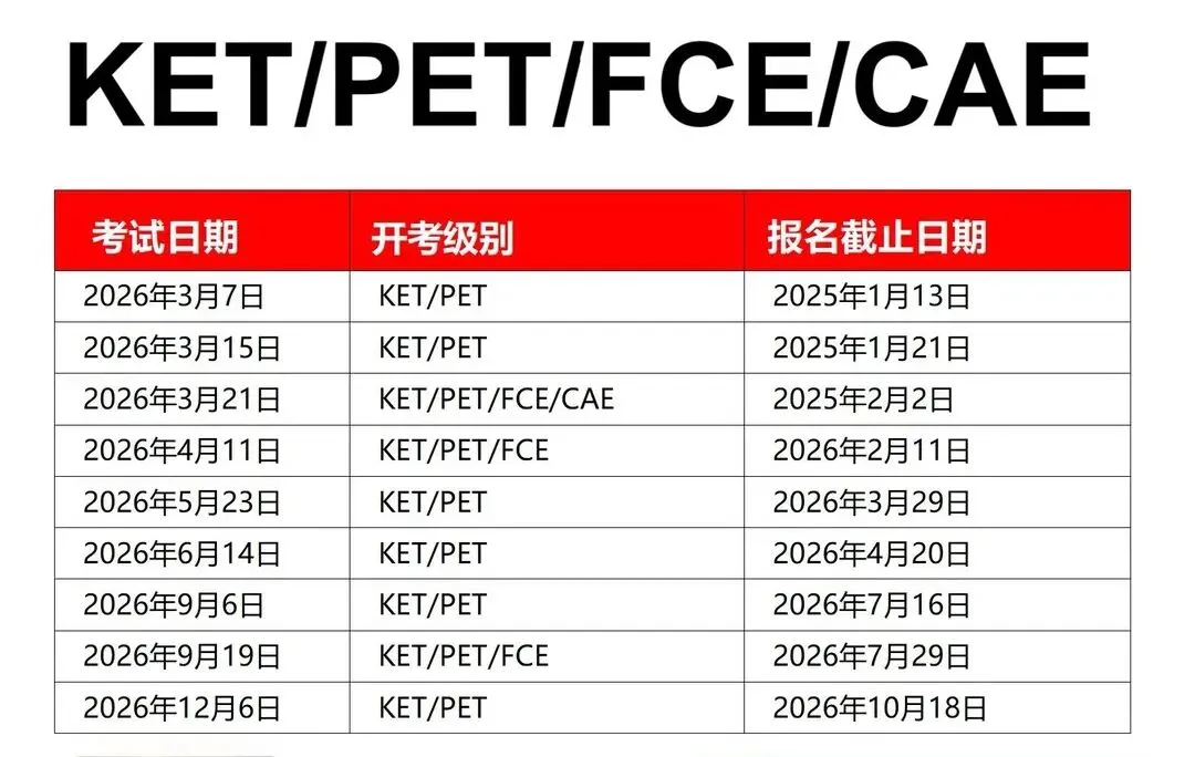 2026年郑州市剑桥英语KET/PET/FCE考试报名时间已发布,考生报名认准官网入口。 ✅报名截止时间 考位紧张,建议提前2-3个月报名,一般按考试时间提前2个月完成报名。 ✅报名截止后不接受退费或转考(转考需在截止前申请并加收20%手续费)。✅考试时间安排 考试通常在周末进行,口试和笔试可能不在同一天(部分考点分两天安排)。 ✅考前1-2周通过邮件发放准考证,需打印并核对个人信息、考试时间及地点。 ✅准考证与证件 考试当天需携带准考证(彩印/黑白均可)和有效身份证件原件。若准考证信息有误,需在考前联系代报名点修改;考试当天发现错误可填写“信息勘误表”。 ✅报名成功确认: 报名成功后,会收到平台官网发送的成功邮件及短信通知。