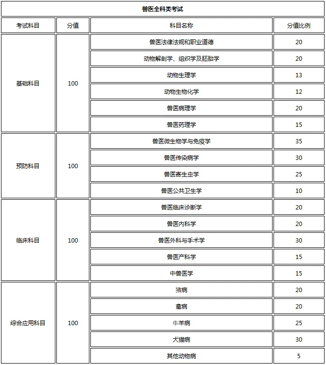 每门科目100道题,每道题1分。考试范围请参考《全国执业兽医资格考试大纲(兽医全科类)(2026版)》、《全国执业兽医资格考试大纲(水生动物类)(2026版)》