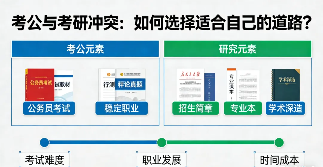 主线考公:以考公备考为核心(每天投入3-4小时),考研仅做“基础准备”(如每天背30分钟英语单词),考公结束后若未上岸,可无缝衔接考研冲刺(利用考公积累的时政、文字能力辅助申论/专业课);