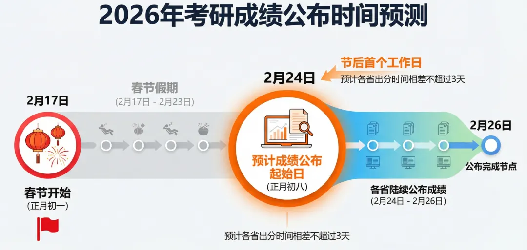 根据历年考研成绩公布规律,结合2026年的春节假期安排,2月24日(正月初八)很可能成为成绩公布的关键起始日。