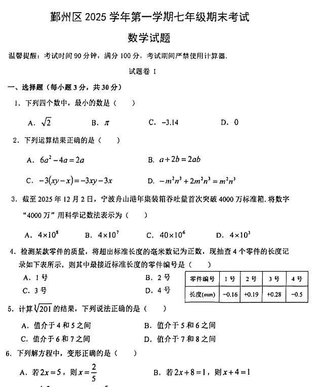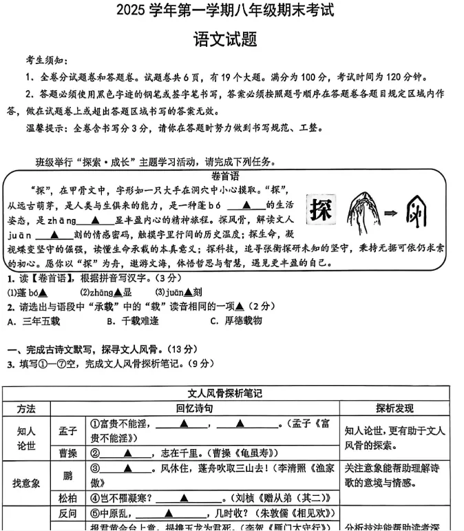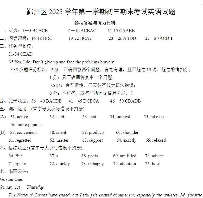 新鲜出炉!2026南京初中期末考试原卷+答案新鲜出炉