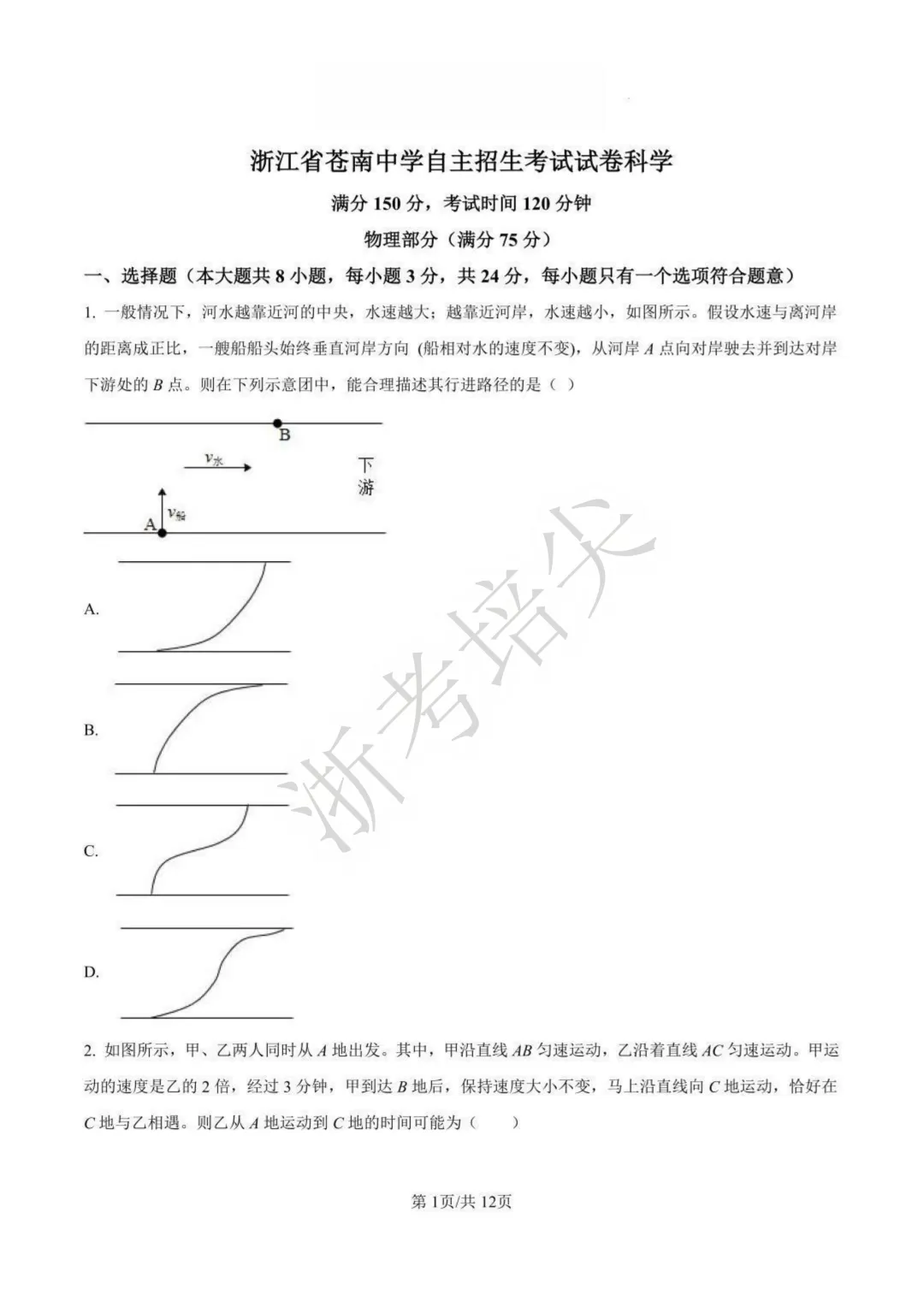 浙江省苍南中学提前招生考试科学试卷(含答案)