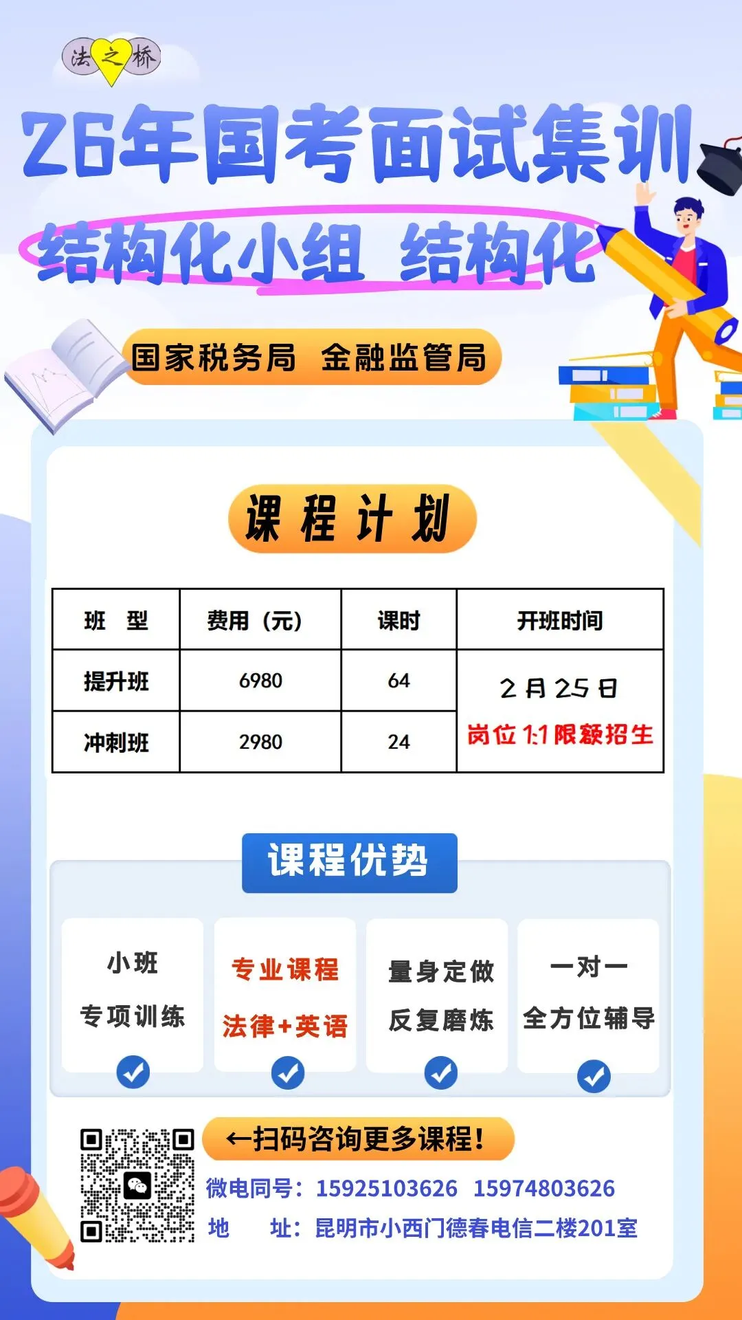 考生按照报考岗位,分金融监管财经类、金融监管财会类、金融监管法律类、金融监管计算机类、金融监管综合类等五类进行面试。面试方式为结构化面试,其中金融监管总局、金融监管局职位含英语口语测试。