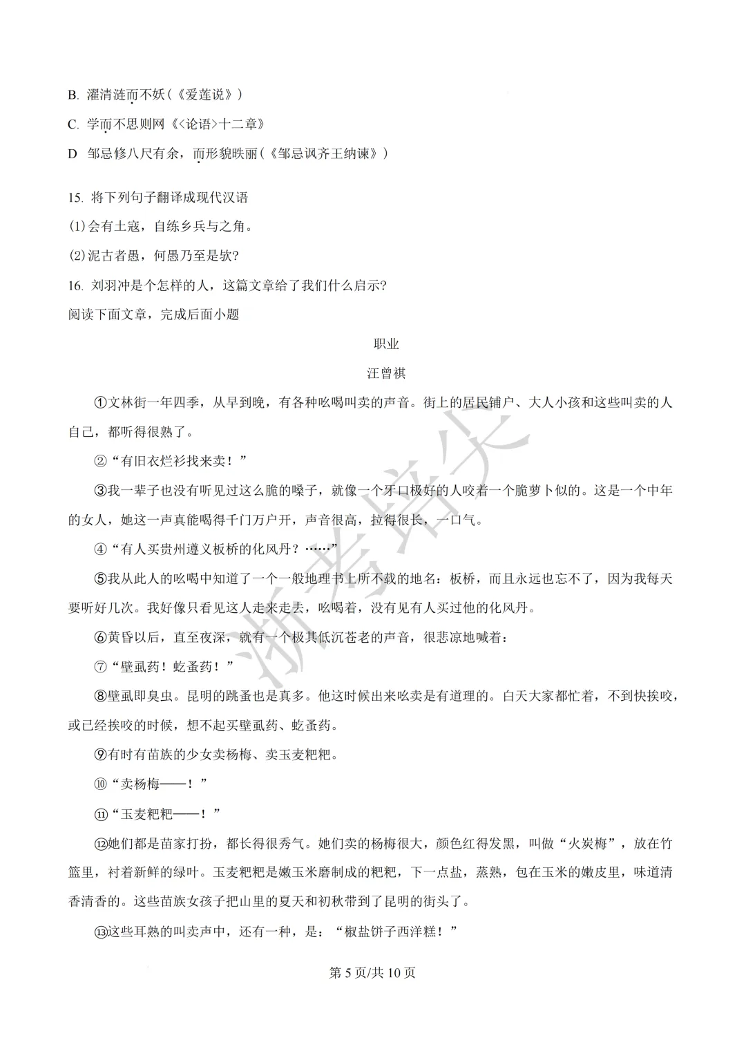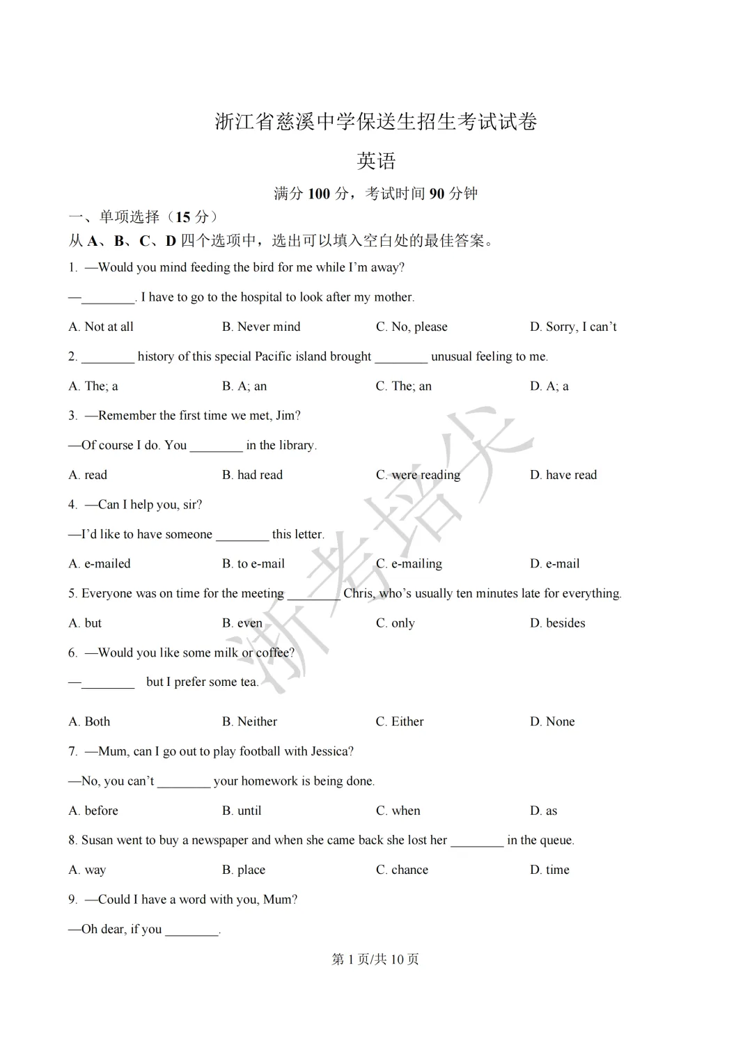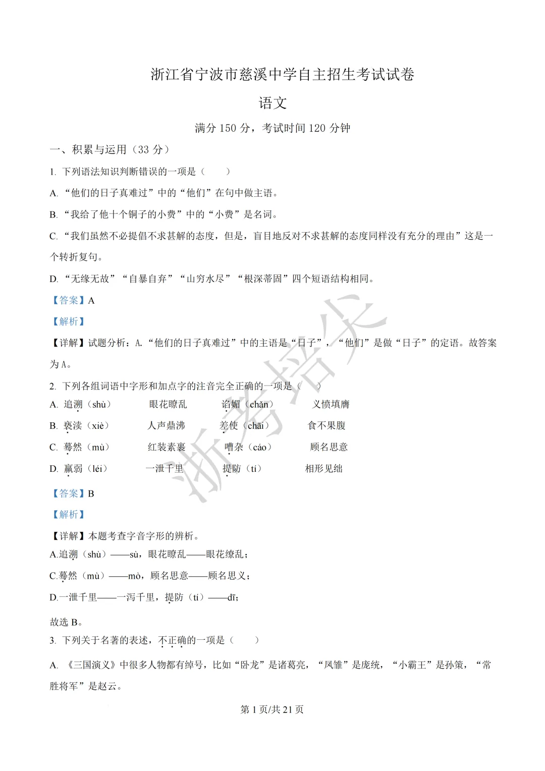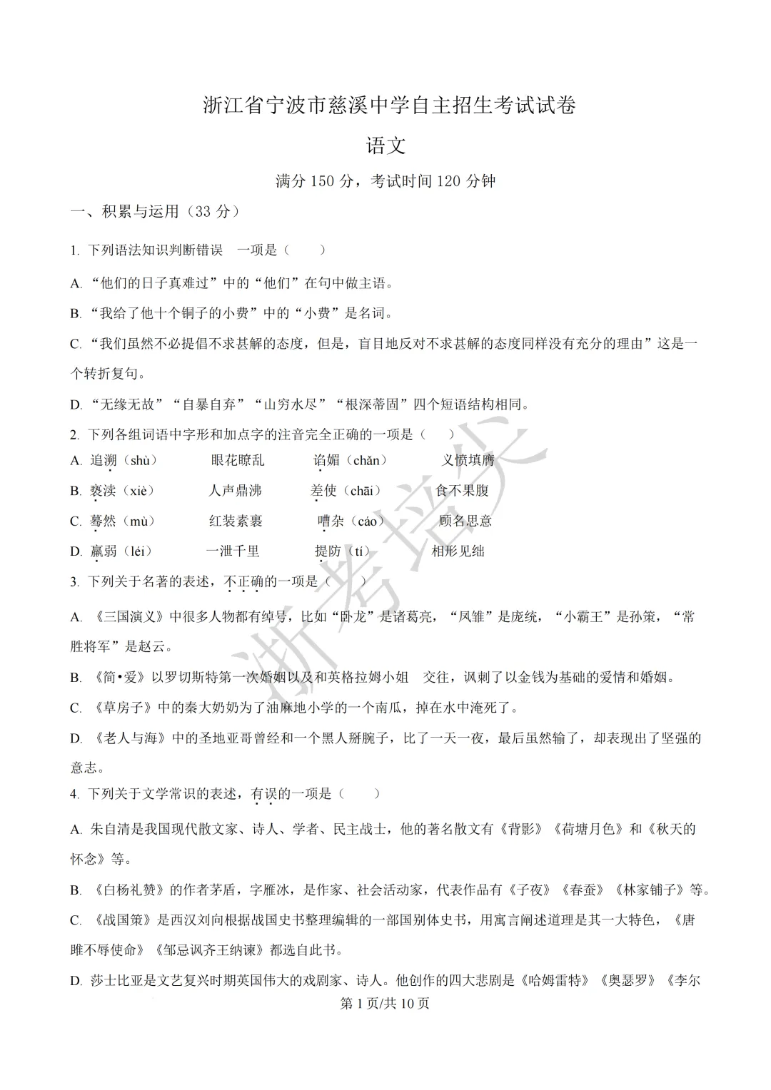 浙江省慈溪中学提前招生考试(英语·语文)试题
