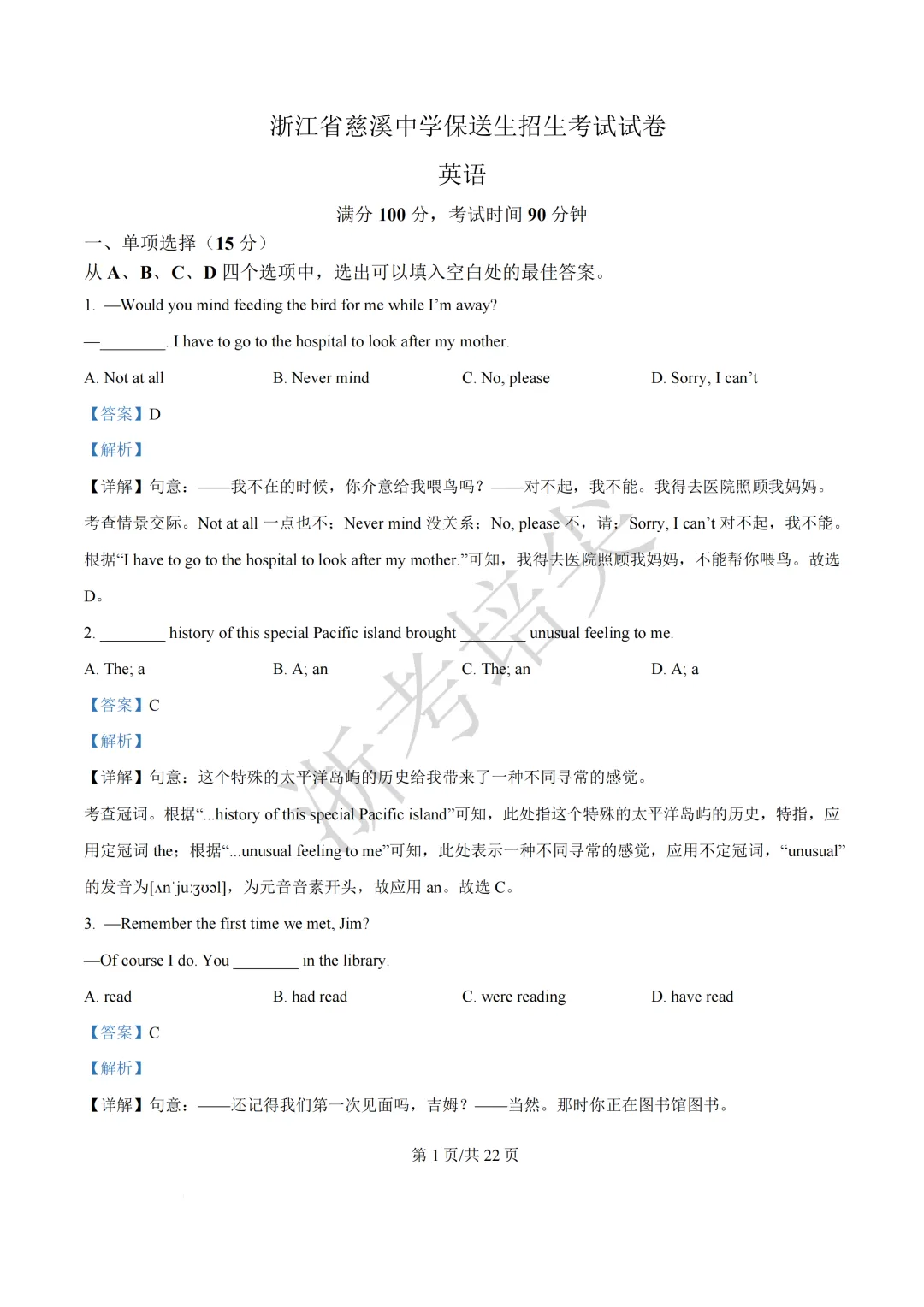 提前招|浙江省余姚中学提前招生考试(数学、英语)试卷(含答案)