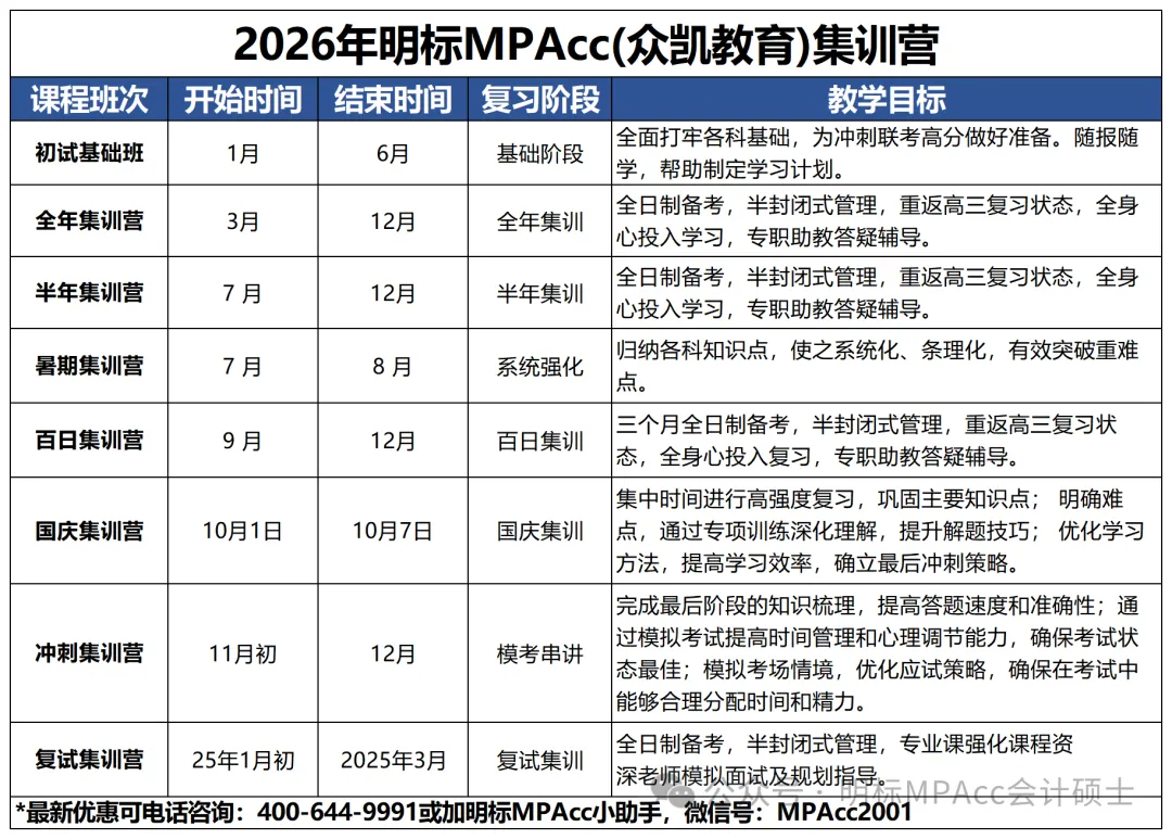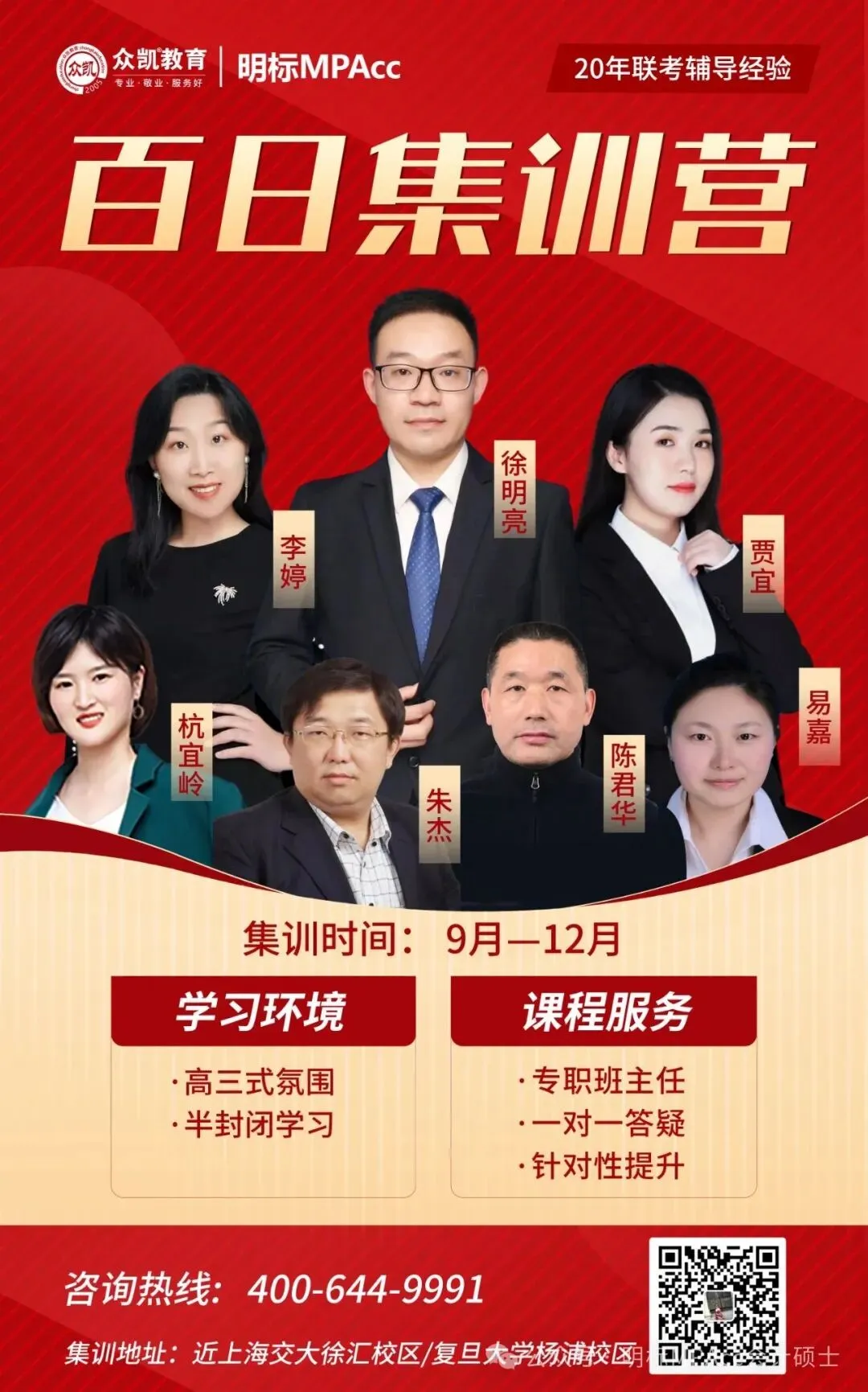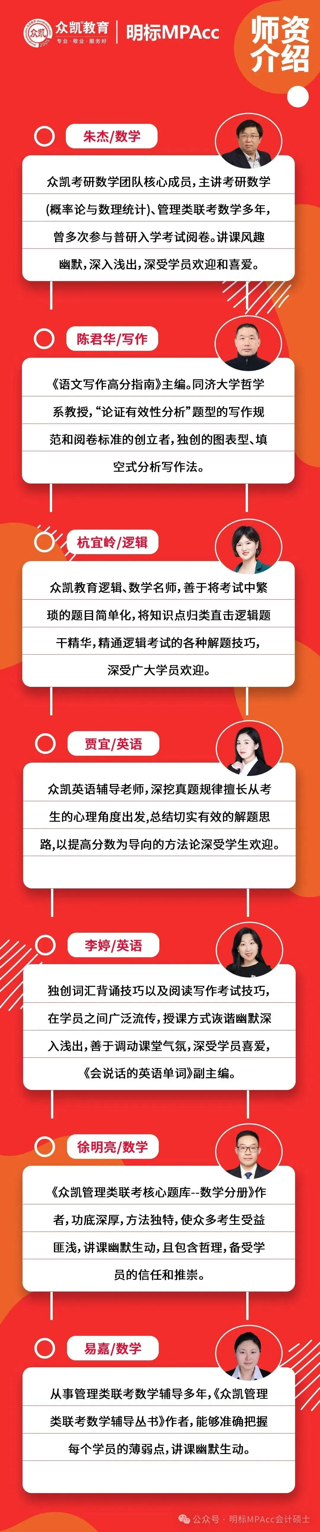 明标MPAcc(众凯教育)集训营,汇聚朱杰、陈君华、徐明亮、易嘉、李婷、杭宜岭、贾宜等一线名师亲临线下授课,更有专职辅导老师跟踪答疑。