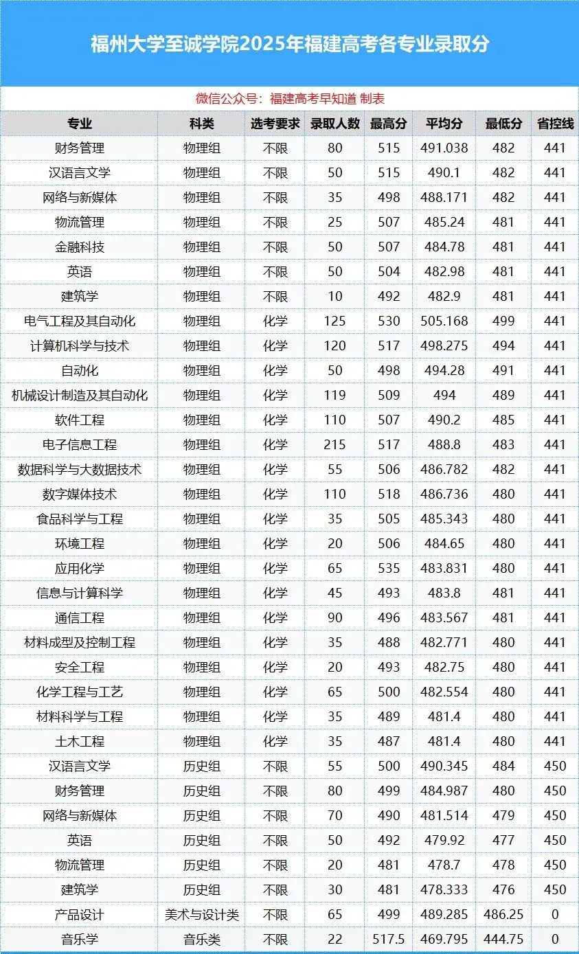 >2025年福建高考福州大学至诚学院各专业录取分数线