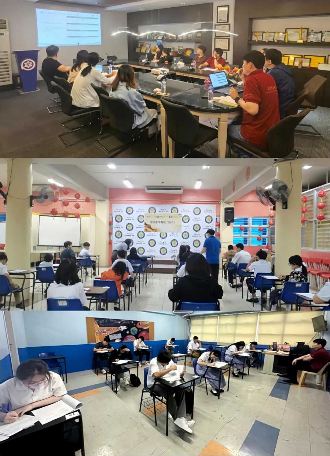 (图片说明)上图:考务会议,中图:HSK一级考场,下图:HSK五级考场。