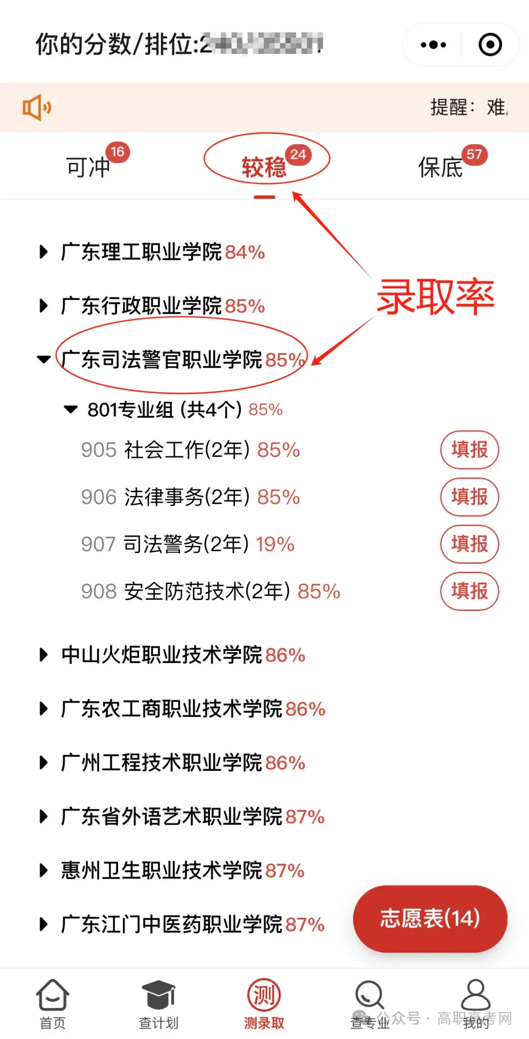 可以在小程序测录取率