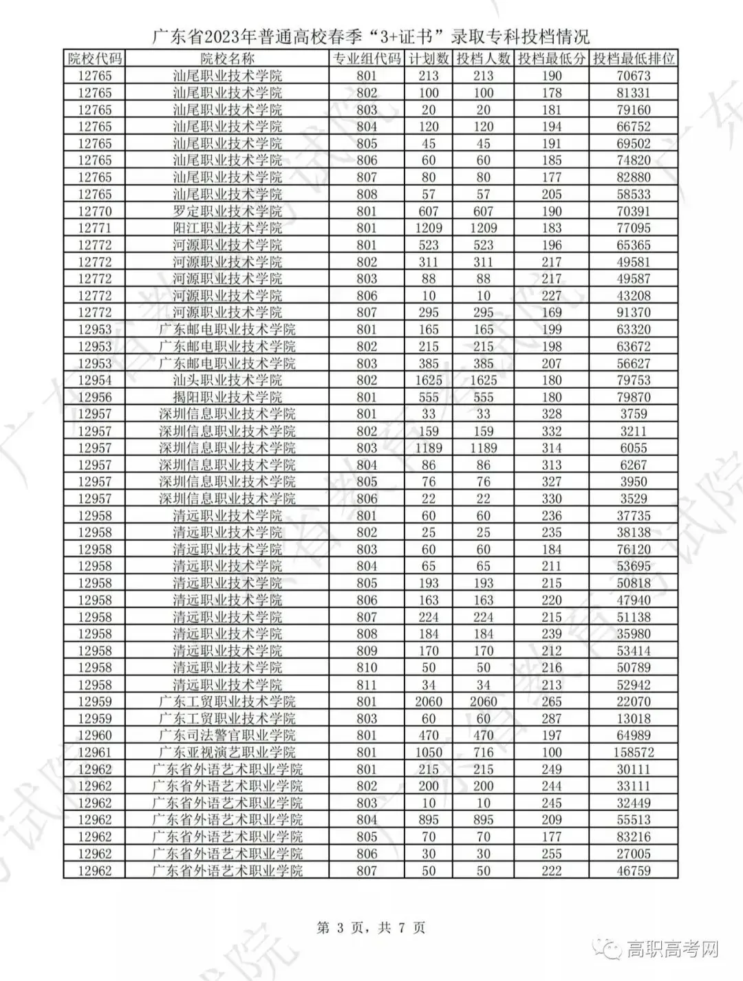 2023年3+证书录取最低分数线