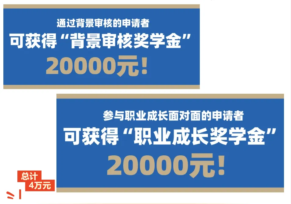 小编仔细查看发现叠加“背景审核奖学金”+“职业成长奖学金”,每人可以获得4万元的高额奖学金。