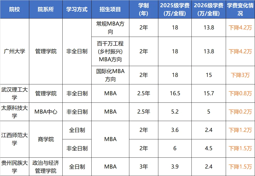 以广州大学工商管理硕士(MBA)为例:其26年非全日制MBA总学费直降3-4.2万,学制由3年变为2年。在学费成本和时间成本上都为考生开“方便之门”。