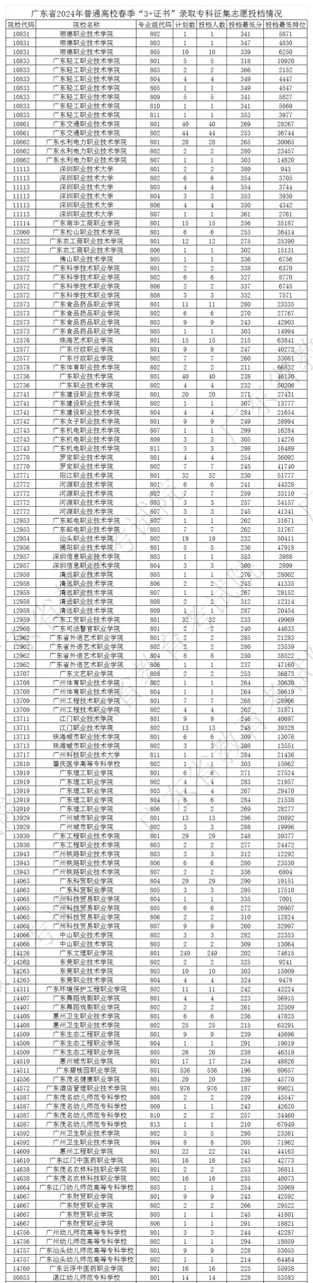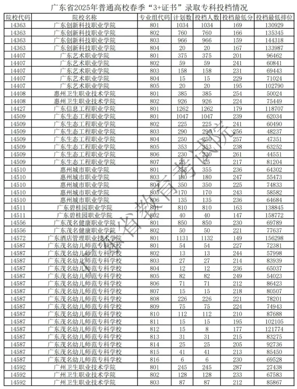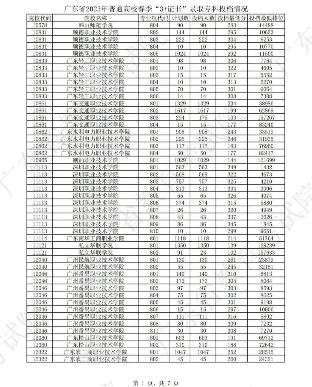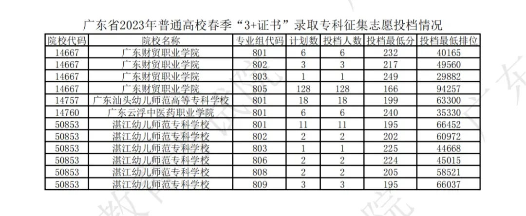 我省2023年春季高考招生录取时间为3月29日至4月7日。29日,“3+证书”本科批次完成投档录取,9所招生院校共录取考生1110人。30日,“依学考成绩录取”和“3+证书”专科批次开始投档,共投出26万多名考生,其中“依学考成绩录取”投出普通类13.9万人、体育类2111人、音乐类524人、舞蹈类239人、美术类5002人、广播电视编导类145人,“3+证书”专科中职生批次投出11.3万人。从投档录取情况看,主要呈现以下几个特点:一、“3+证书”本科批次依旧延续“火热”势头。今年我省“3+证书”本科批次录取均一次满档,共录取1110人,比上年增加217人;其中公办本科院校录取310人,民办本科院校录取800人。这反映出我省优质中职学校生源质量正在快速提升,中职毕业生对学历层次尤其是对本科学历的提升需求在不断增加,中职生就读本科层次升学路径进一步打通。二、专科批次院校专业组录取形势良好。从专科批次投档情况看,“依学考成绩录取”普通类一次性满档的院校专业组有237个,满档率为94.8%;“3+证书”专科中职生批次一次性满档院校专业组有305个,满档率为92.4%。其中,地处经济发达城市且办学基础较好的院校及国家“双高计划”建设院校均一次性满档,且投档最低分也较高。如“依学考成绩录取”普通类的深圳职业技术学院、深圳信息职业技术学院、广州番禺职业技术学院部分院校专业组投档最低分均超过385分,分别为397分、387分、386分。“3+证书”专科中职生批次的深圳职业技术学院、深圳信息职业技术学院部分院校专业组投档分数线均超过330分,分别为349分、332分。三、民办高职院校生源质量不断提升。经过多年办学积累,我省民办院校的办学质量和教学质量不断提升,社会认可度不断提高,吸引了越来越多的考生填报,今年“依学考成绩录取”普通类、“3+证书”专科中职生批次大部分民办高职院校专业组均满档。投档后,“依学考成绩录取”普通类仅有13个院校专业组有缺额,“3+证书”专科中职生批次有25个院校专业组有缺额。根据我省春季高考录取工作安排,“依学考成绩录取”和“3+证书”考试专科批次录取将于4月1日结束,对未完成招生计划的院校专业,省招生办将组织考生进行征集志愿。预计,4月4日省招生办将公布缺额计划;4-6日,组织考生填报征集志愿。2023年“3+证书”第一次投档结果公布!