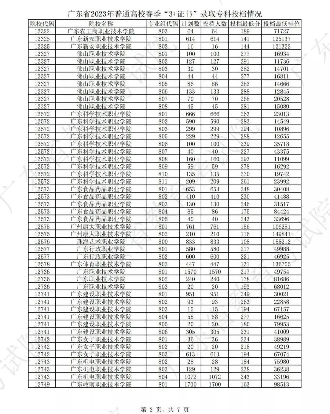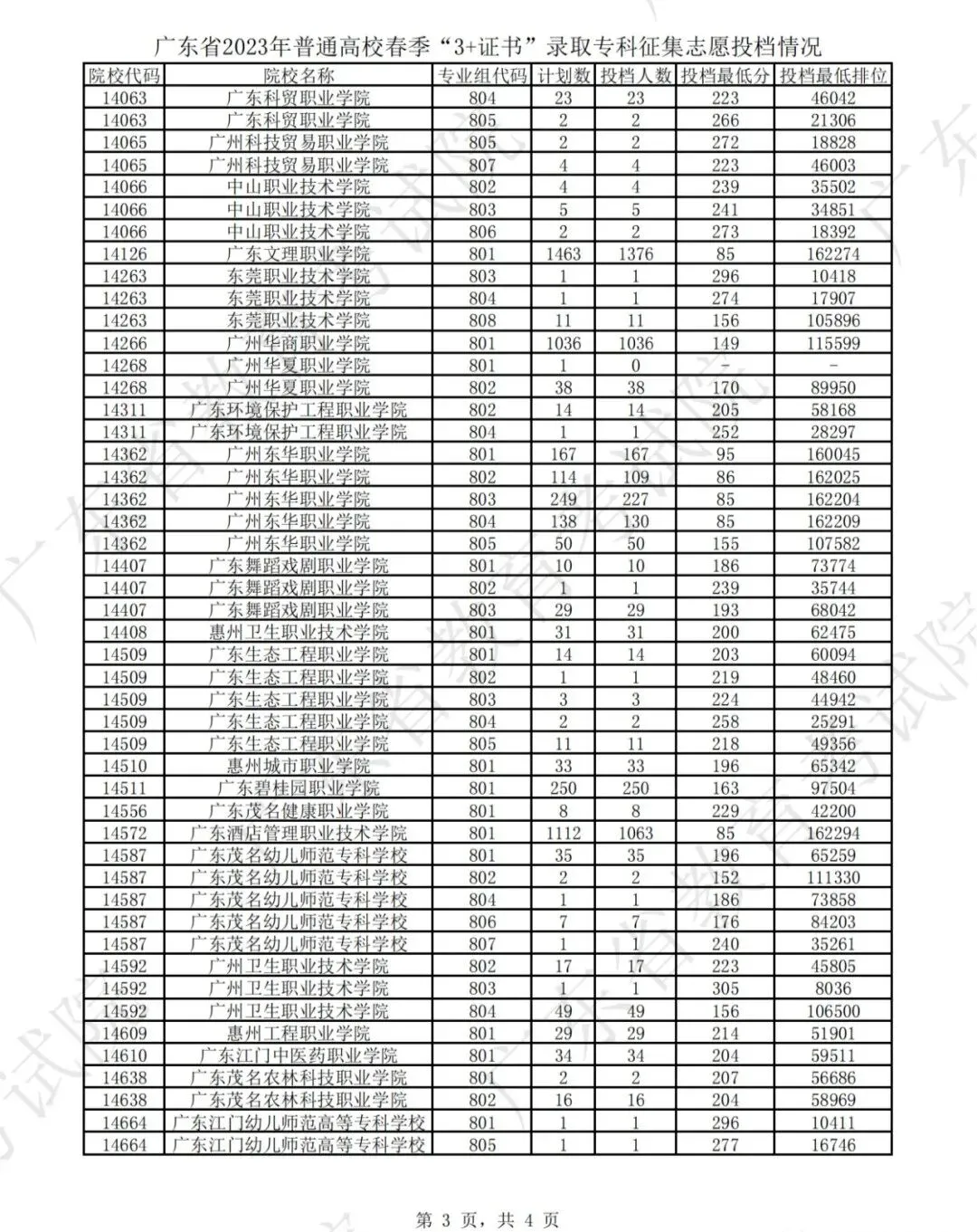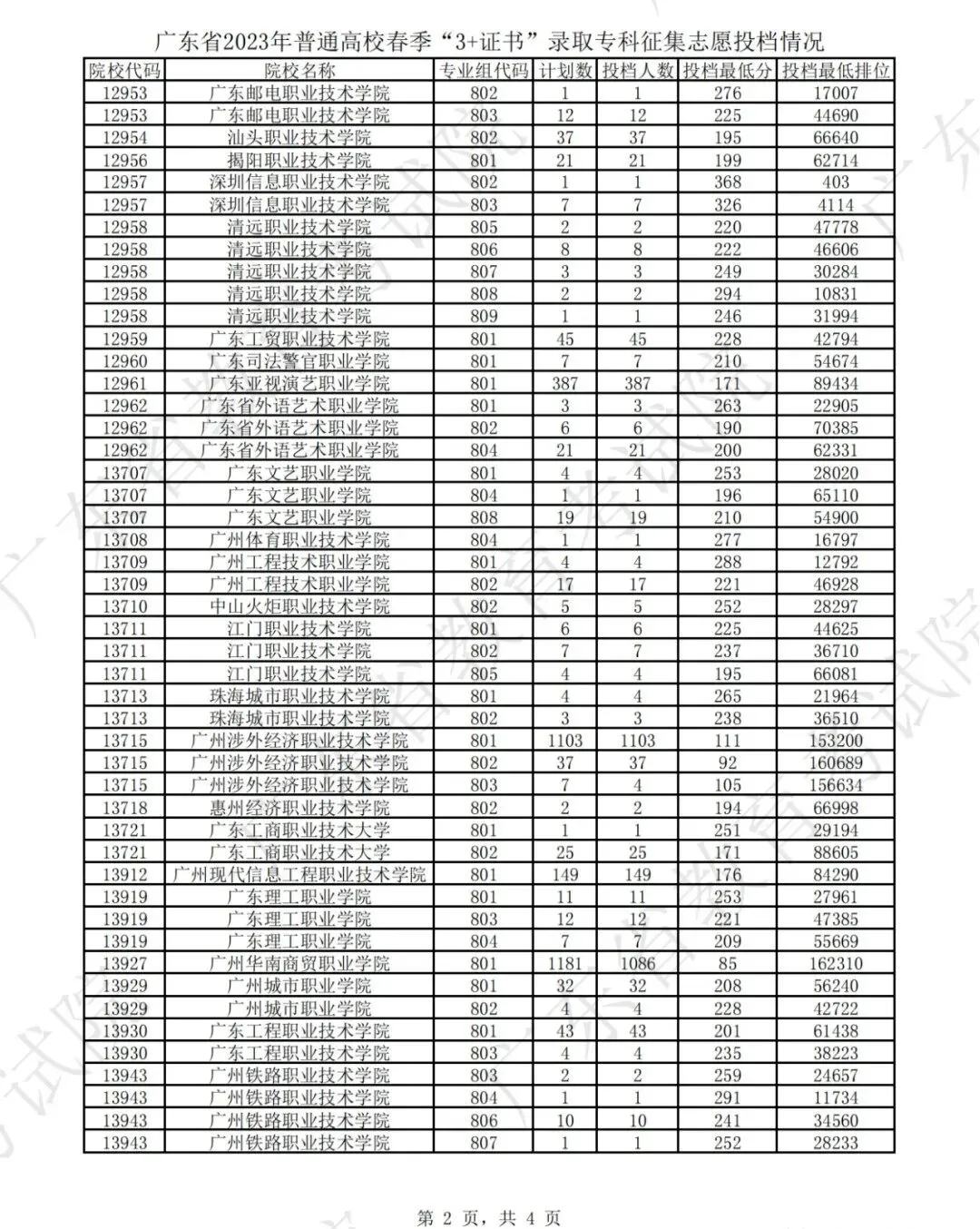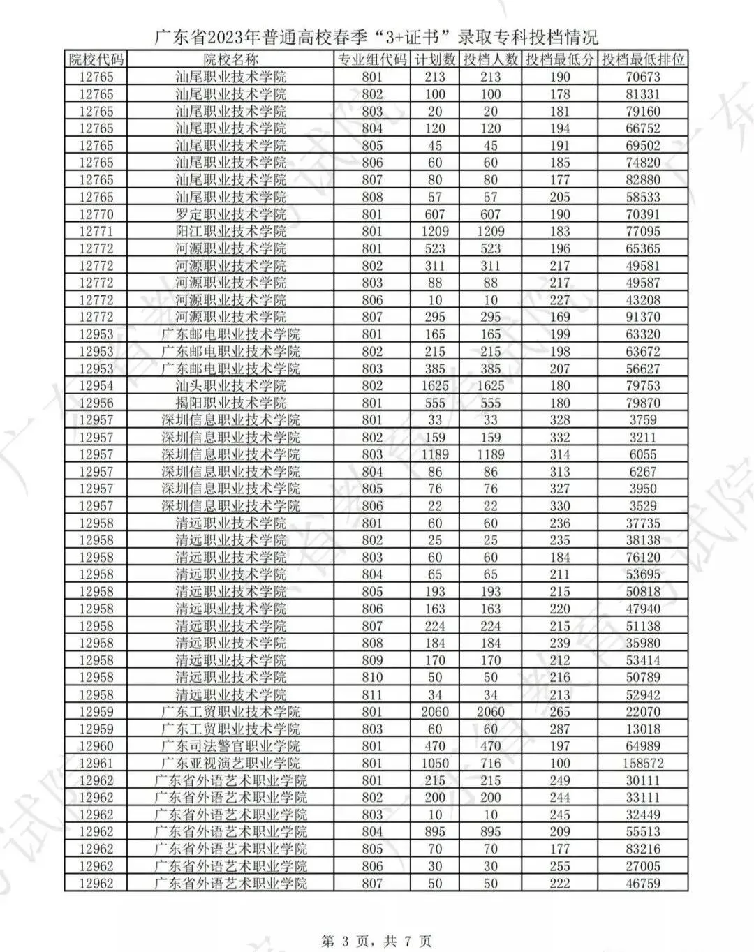 我省2023年春季高考招生录取时间为3月29日至4月7日。29日,“3+证书”本科批次完成投档录取,9所招生院校共录取考生1110人。30日,“依学考成绩录取”和“3+证书”专科批次开始投档,共投出26万多名考生,其中“依学考成绩录取”投出普通类13.9万人、体育类2111人、音乐类524人、舞蹈类239人、美术类5002人、广播电视编导类145人,“3+证书”专科中职生批次投出11.3万人。从投档录取情况看,主要呈现以下几个特点:一、“3+证书”本科批次依旧延续“火热”势头。今年我省“3+证书”本科批次录取均一次满档,共录取1110人,比上年增加217人;其中公办本科院校录取310人,民办本科院校录取800人。这反映出我省优质中职学校生源质量正在快速提升,中职毕业生对学历层次尤其是对本科学历的提升需求在不断增加,中职生就读本科层次升学路径进一步打通。二、专科批次院校专业组录取形势良好。从专科批次投档情况看,“依学考成绩录取”普通类一次性满档的院校专业组有237个,满档率为94.8%;“3+证书”专科中职生批次一次性满档院校专业组有305个,满档率为92.4%。其中,地处经济发达城市且办学基础较好的院校及国家“双高计划”建设院校均一次性满档,且投档最低分也较高。如“依学考成绩录取”普通类的深圳职业技术学院、深圳信息职业技术学院、广州番禺职业技术学院部分院校专业组投档最低分均超过385分,分别为397分、387分、386分。“3+证书”专科中职生批次的深圳职业技术学院、深圳信息职业技术学院部分院校专业组投档分数线均超过330分,分别为349分、332分。三、民办高职院校生源质量不断提升。经过多年办学积累,我省民办院校的办学质量和教学质量不断提升,社会认可度不断提高,吸引了越来越多的考生填报,今年“依学考成绩录取”普通类、“3+证书”专科中职生批次大部分民办高职院校专业组均满档。投档后,“依学考成绩录取”普通类仅有13个院校专业组有缺额,“3+证书”专科中职生批次有25个院校专业组有缺额。根据我省春季高考录取工作安排,“依学考成绩录取”和“3+证书”考试专科批次录取将于4月1日结束,对未完成招生计划的院校专业,省招生办将组织考生进行征集志愿。预计,4月4日省招生办将公布缺额计划;4-6日,组织考生填报征集志愿。2023年“3+证书”第一次投档结果公布!