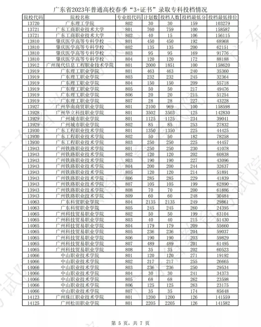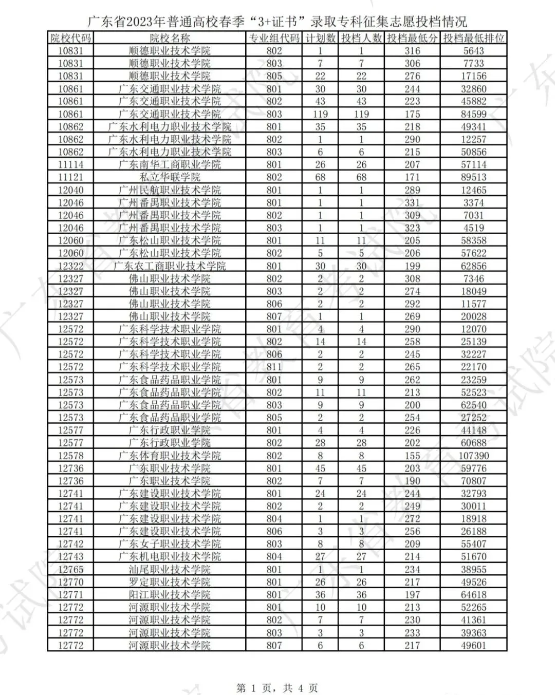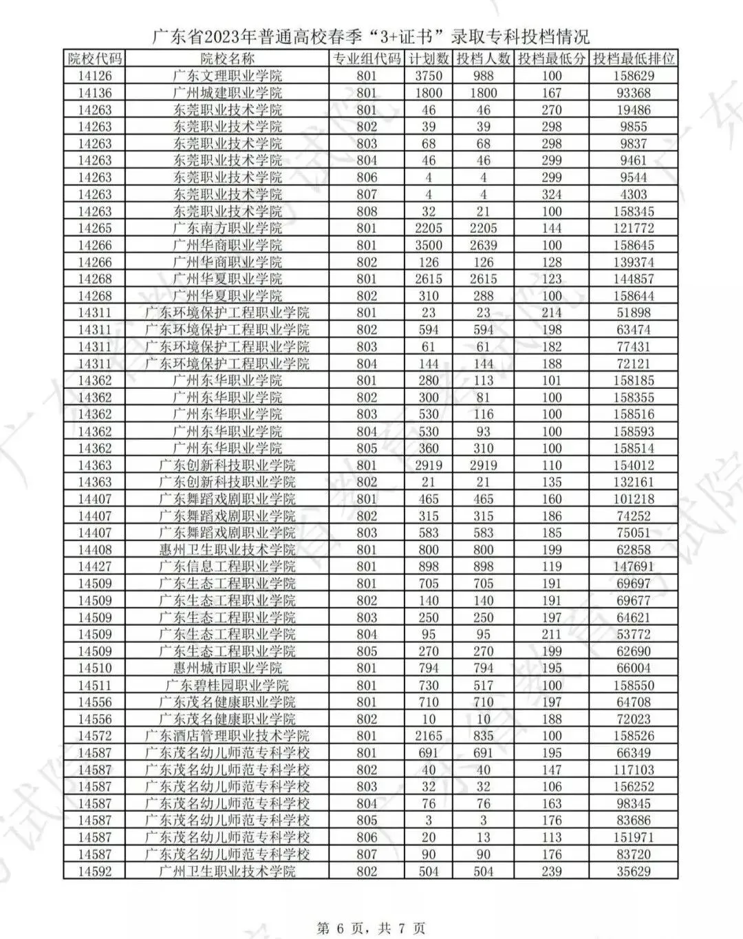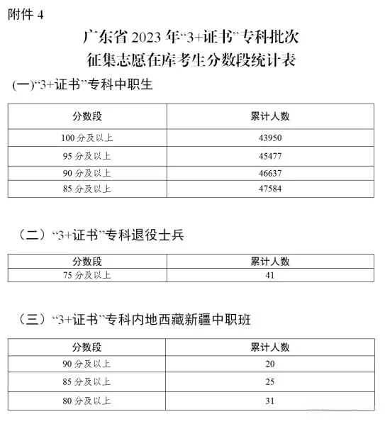 我省2023年春季高考招生录取时间为3月29日至4月7日。29日,“3+证书”本科批次完成投档录取,9所招生院校共录取考生1110人。30日,“依学考成绩录取”和“3+证书”专科批次开始投档,共投出26万多名考生,其中“依学考成绩录取”投出普通类13.9万人、体育类2111人、音乐类524人、舞蹈类239人、美术类5002人、广播电视编导类145人,“3+证书”专科中职生批次投出11.3万人。从投档录取情况看,主要呈现以下几个特点:一、“3+证书”本科批次依旧延续“火热”势头。今年我省“3+证书”本科批次录取均一次满档,共录取1110人,比上年增加217人;其中公办本科院校录取310人,民办本科院校录取800人。这反映出我省优质中职学校生源质量正在快速提升,中职毕业生对学历层次尤其是对本科学历的提升需求在不断增加,中职生就读本科层次升学路径进一步打通。二、专科批次院校专业组录取形势良好。从专科批次投档情况看,“依学考成绩录取”普通类一次性满档的院校专业组有237个,满档率为94.8%;“3+证书”专科中职生批次一次性满档院校专业组有305个,满档率为92.4%。其中,地处经济发达城市且办学基础较好的院校及国家“双高计划”建设院校均一次性满档,且投档最低分也较高。如“依学考成绩录取”普通类的深圳职业技术学院、深圳信息职业技术学院、广州番禺职业技术学院部分院校专业组投档最低分均超过385分,分别为397分、387分、386分。“3+证书”专科中职生批次的深圳职业技术学院、深圳信息职业技术学院部分院校专业组投档分数线均超过330分,分别为349分、332分。三、民办高职院校生源质量不断提升。经过多年办学积累,我省民办院校的办学质量和教学质量不断提升,社会认可度不断提高,吸引了越来越多的考生填报,今年“依学考成绩录取”普通类、“3+证书”专科中职生批次大部分民办高职院校专业组均满档。投档后,“依学考成绩录取”普通类仅有13个院校专业组有缺额,“3+证书”专科中职生批次有25个院校专业组有缺额。根据我省春季高考录取工作安排,“依学考成绩录取”和“3+证书”考试专科批次录取将于4月1日结束,对未完成招生计划的院校专业,省招生办将组织考生进行征集志愿。预计,4月4日省招生办将公布缺额计划;4-6日,组织考生填报征集志愿。2023年“3+证书”第一次投档结果公布!