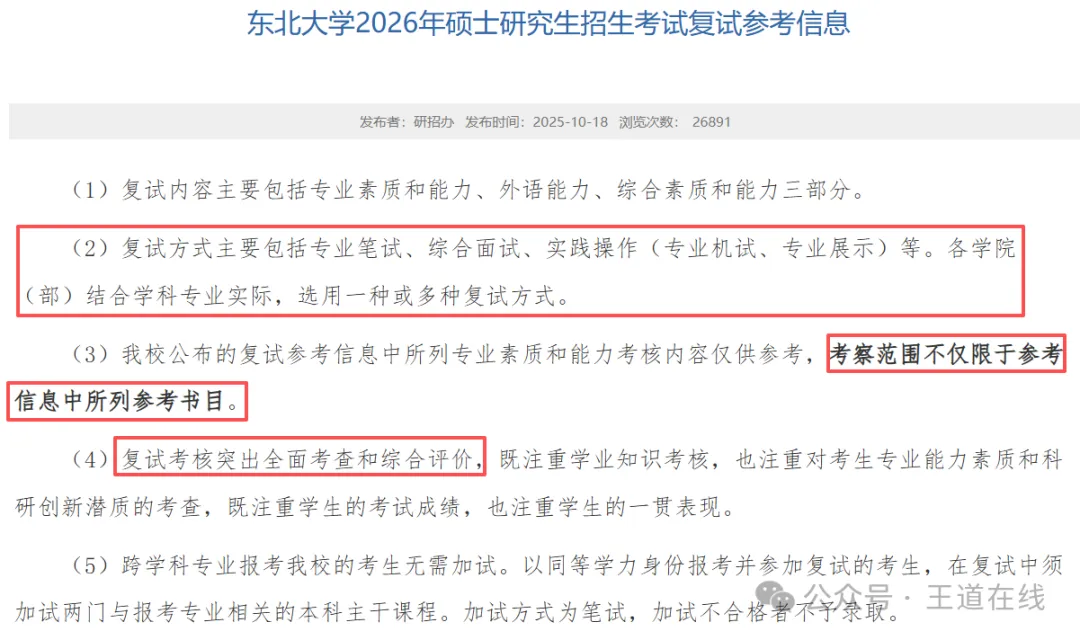 东北大学25考研就已经取消笔试,26考研复试延续了这一要求。复试方式主要包括:笔试、面试、实践操作(专业机试、专业展示)等。各学院(部)结合学科专业实际,选用一种或多种复试方式。