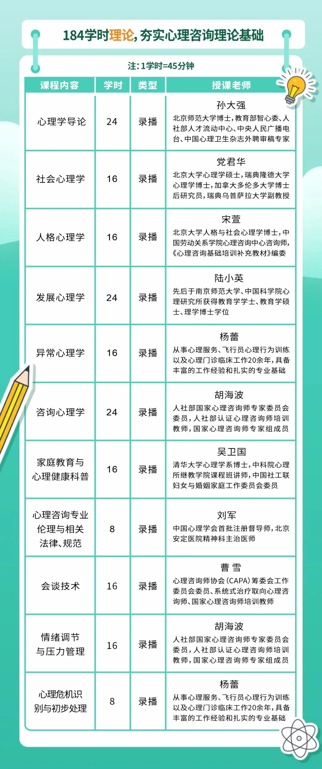 严格按照《中国心理学会心理咨询师水平评价规范(试行)》设计培训内容,整体培训项目内容涵盖理论教学、实操训练、案例研讨、见习实习等丰富形式,让你在理论与实践的双重滋养下稳步成长。
