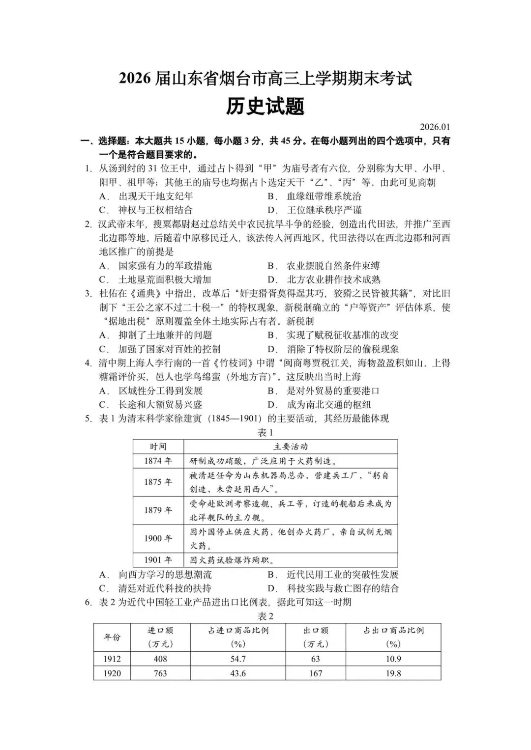 2026届山东省烟台市高三上学期期末考试历史试题